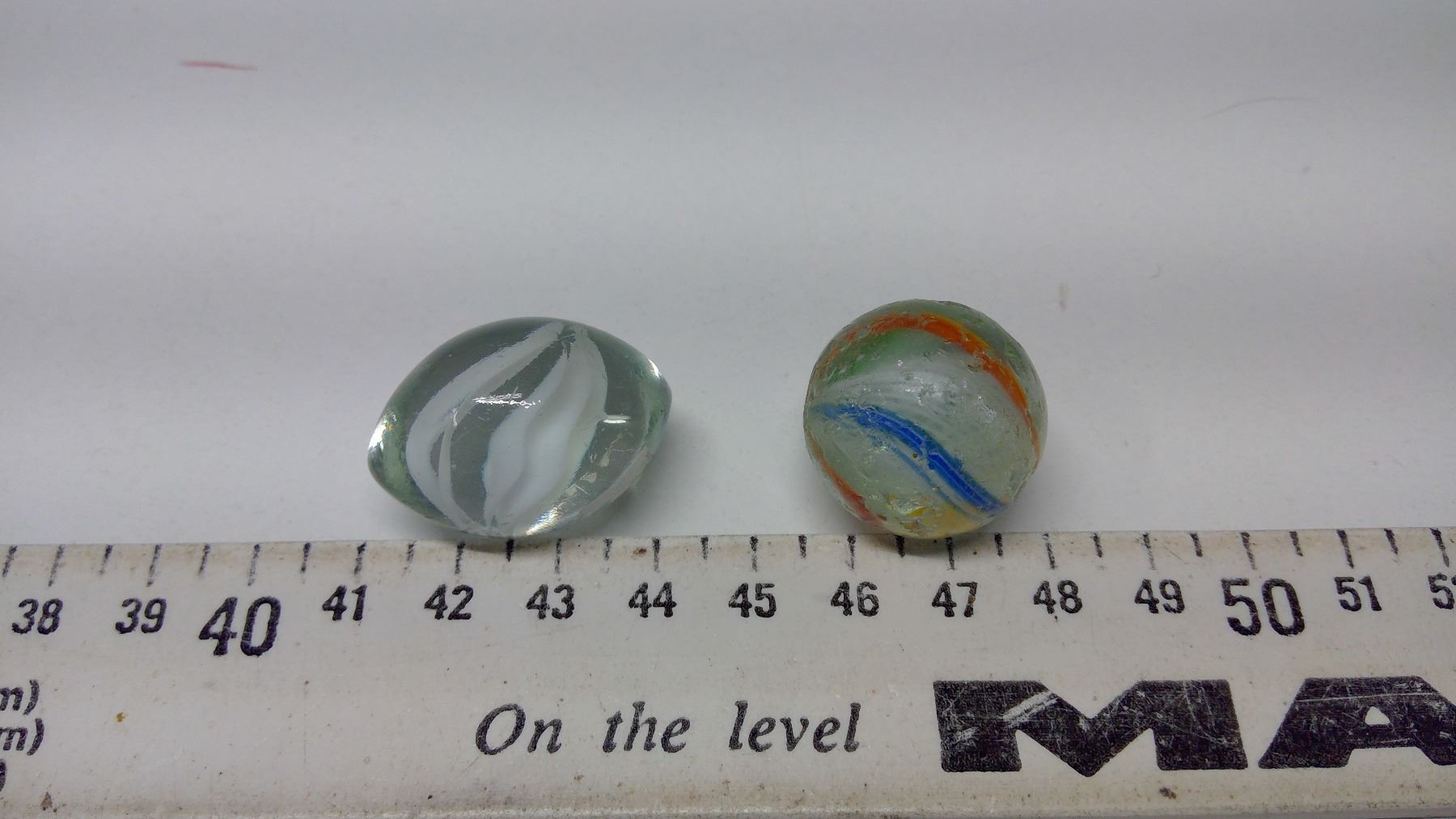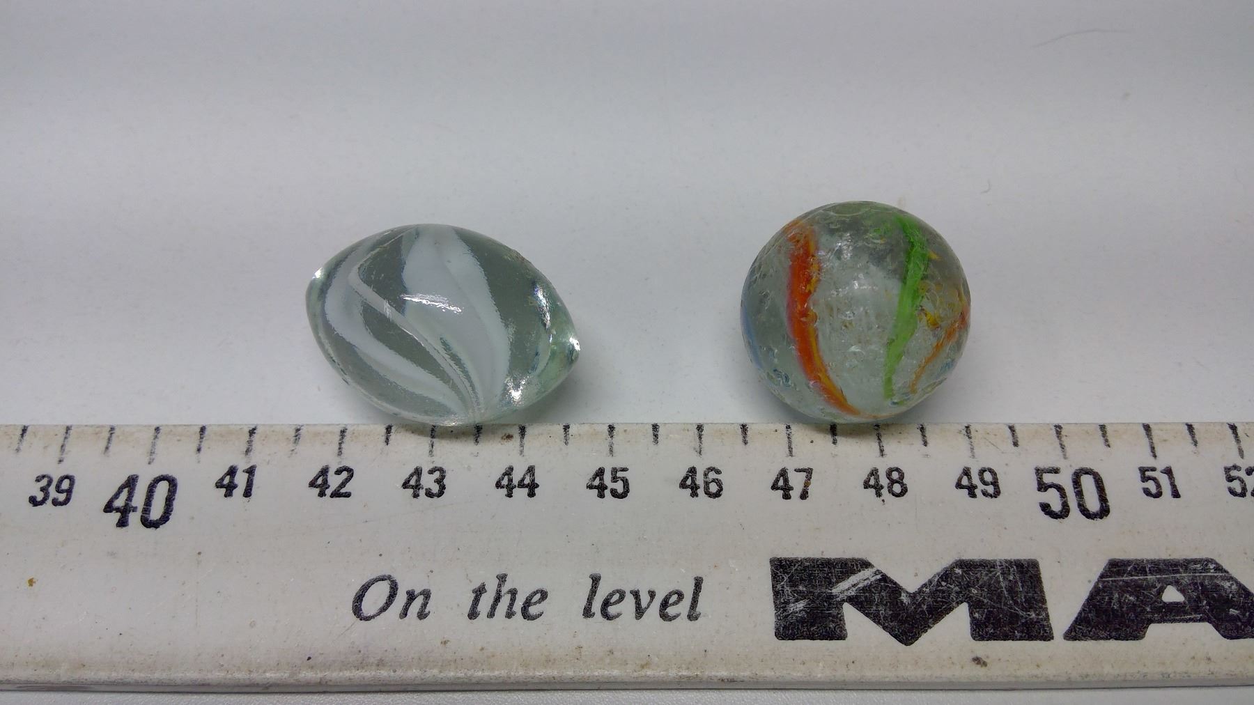 Marbles, latticinio core 1” good condition, and odd football shaped marble clear, white streaks