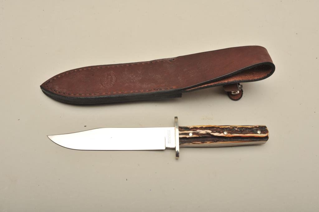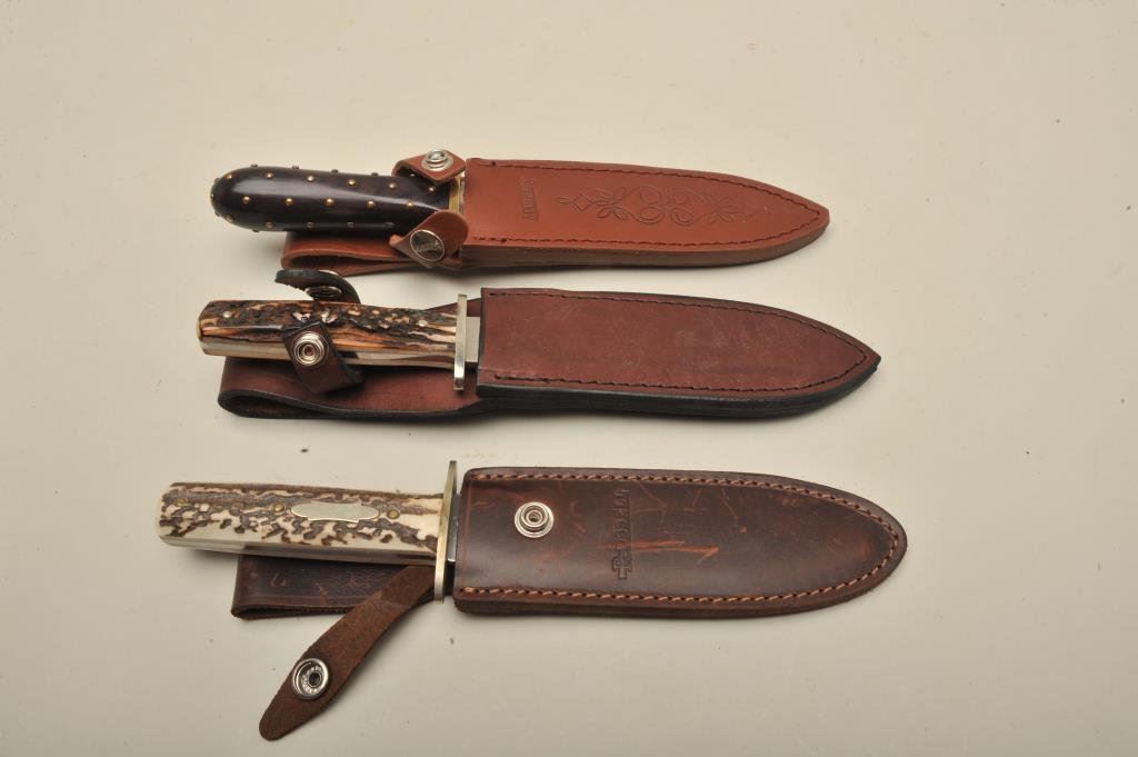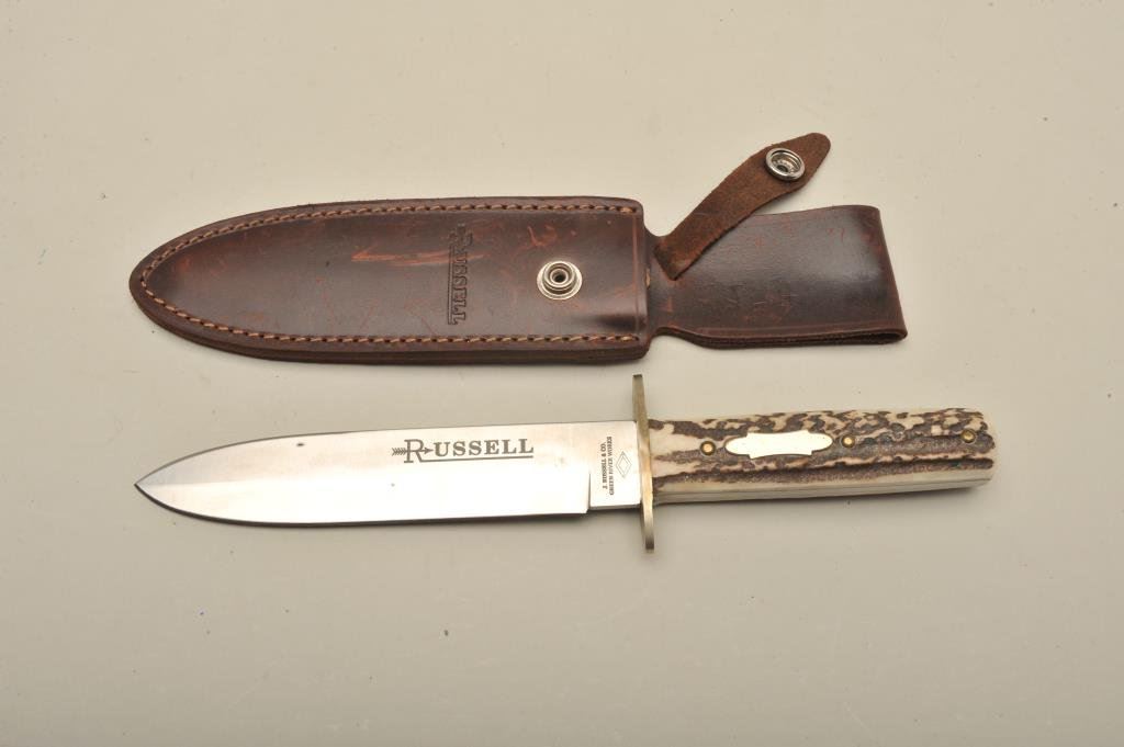 Russell with stag grip 10.5" with scabbard. North Woods Knife Co. Gladstone clip point belt size 9.5" overall excellent condition.