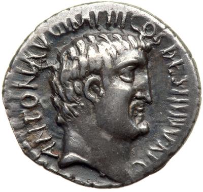 Marc Antony, died 30 BC. AR Denarius, struck 33 BC at the mint moving with Antony. Bare head right of Marc Antony; in hair behind ear, artist's initial "P". Reverse: Legend in two lines. Cr. 542/2; Syd. 1209. A wonderful portrait; signed by artist. Nicely toned. Choice Very Fine.