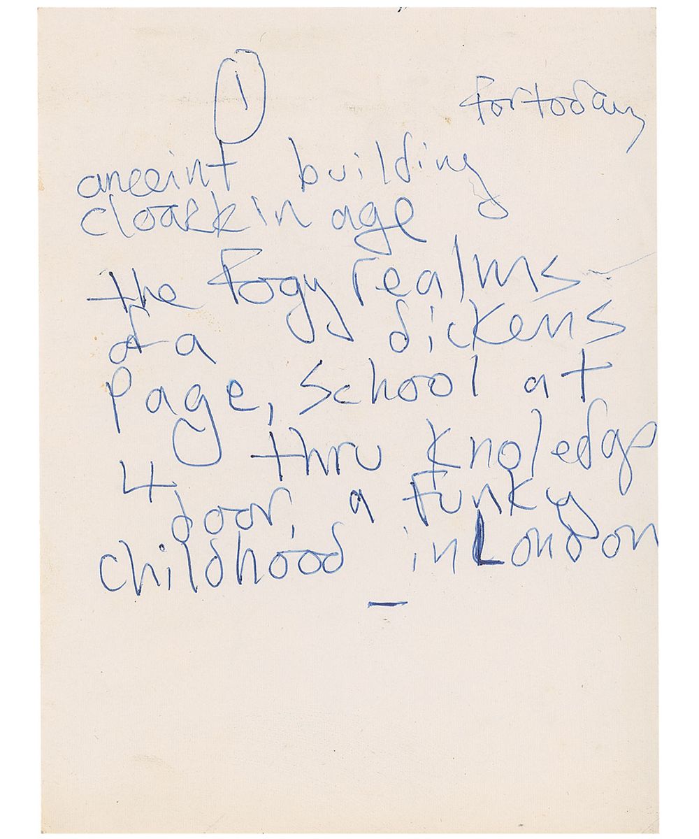 Bolan pens partial lyrics to the song ‘Funky Childhood,’ one page, 6 x 9, in full (spelling and grammar retained): “1. for today/ ancient building/ cloack in age/ the foggy realms/ of a dickens/ page, school at/ 4 thru knoledge/ door, a funky/ childhood in London.” Scattered creases and some mild toning, otherwise fine condition. Accompanied by a copy of a letter indicating that the page was purchased from the proprietors of the official Marc Bolan fan club and a certificate of authenticity from Tracks.