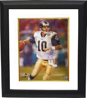 In 2003, Marc Bulger helped lead the Rams to a regular-season record of 12-4 and the division championship. Bulger was the MVP of the 2004 Pro Bowl. After the 2006 season, Bulger was selected as a reserve the Pro Bowl, after recording an NFL-best eight games with a quarterback passing rating of more than 100. It marked the second time that he was voted to the Pro Bowl. Marc Bulger has hand autographed this St. Louis Rams 16X20 Color Photo. GTSM Hologram and Certificate of Authenticity from Athlon Sports. Custom White Mat and Premium Black Framed as shown.