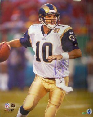 In 2003, Marc Bulger helped lead the Rams to a regular-season record of 12-4 and the division championship. Bulger was the MVP of the 2004 Pro Bowl. After the 2006 season, Bulger was selected as a reserve the Pro Bowl, after recording an NFL-best eight games with a quarterback passing rating of more than 100. It marked the second time that he was voted to the Pro Bowl. Marc Bulger has hand autographed this St. Louis Rams 16X20 Color Photo. GTSM Hologram and Certificate of Authenticity from Athlon Sports.