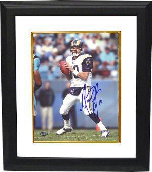 In 2003, Marc Bulger helped lead the Rams to a regular-season record of 12-4 and the division championship. Bulger was the MVP of the 2004 Pro Bowl. After the 2006 season, Bulger was selected as a reserve the Pro Bowl, after recording an NFL-best eight games with a quarterback passing rating of more than 100. It marked the second time that he was voted to the Pro Bowl. Marc Bulger has hand autographed this St. Louis Rams 8x10 Color Photo. GTSM Hologram and Certificate of Authenticity from Athlon Sports. Custom White Mat and Premium Black Framed as shown.