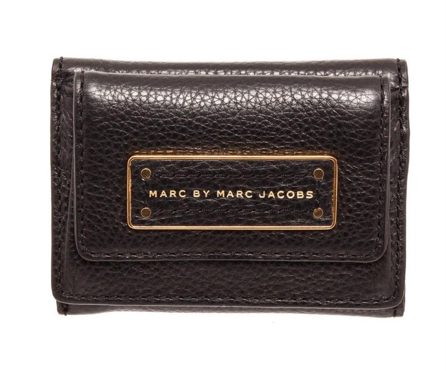 Marc By Marc Jacobs black leather mini compact flap wallet with gold-tone hardware, logo placard at front, pouch pocket at front face with snap closure, black leather interior lining, three card slots, bill compartment at top and overall snap closure. Measurements: Length: 4.15 in / 11 cm Width: 1 in / 3 cm 3.1 in / 8 cmCONDITION: Pre-Owned Good overall, please see photographs for detail.