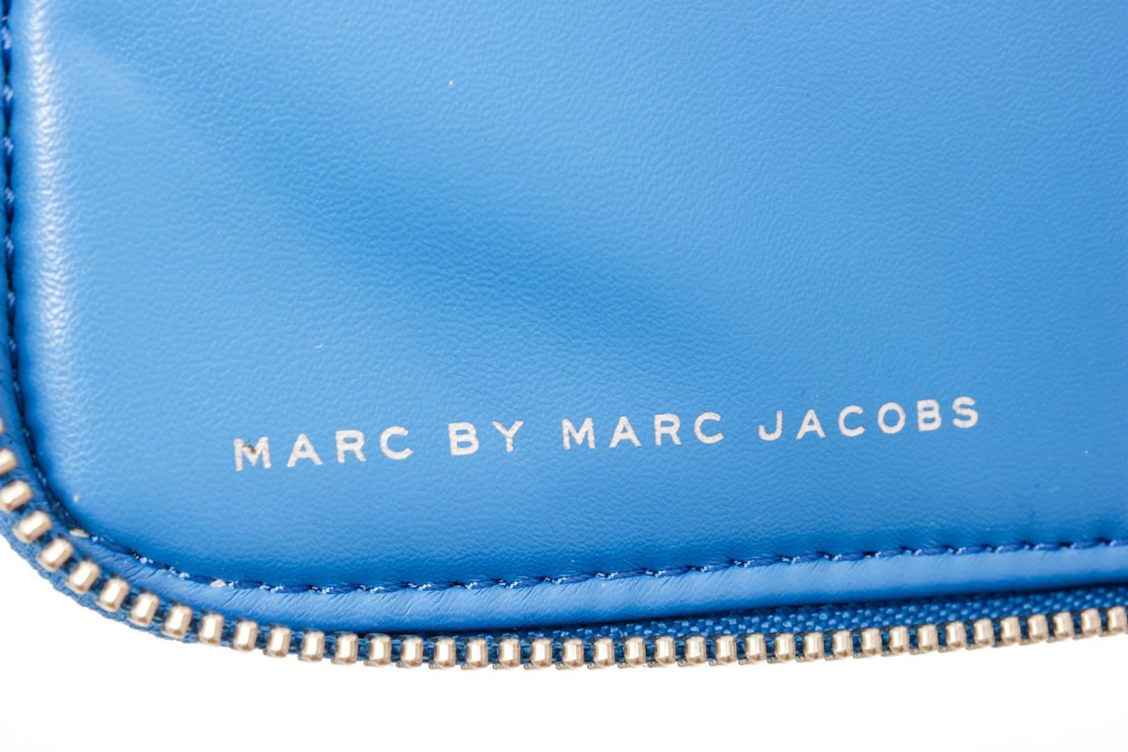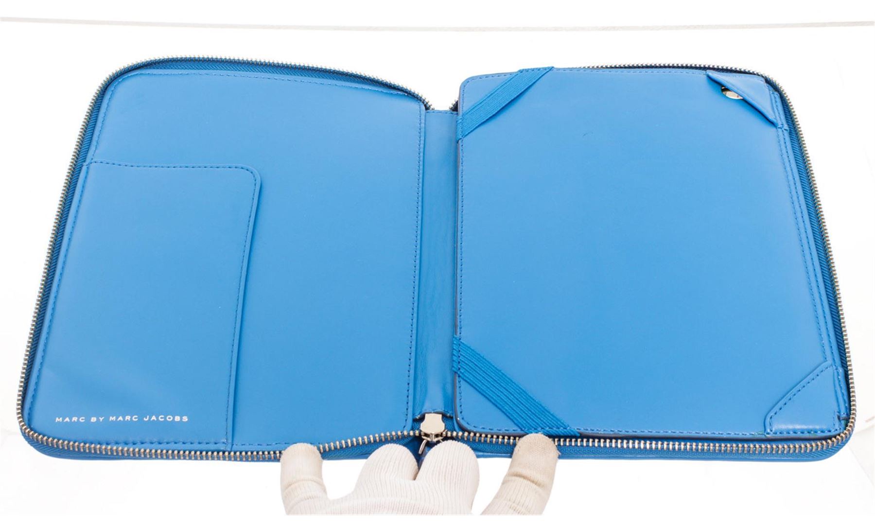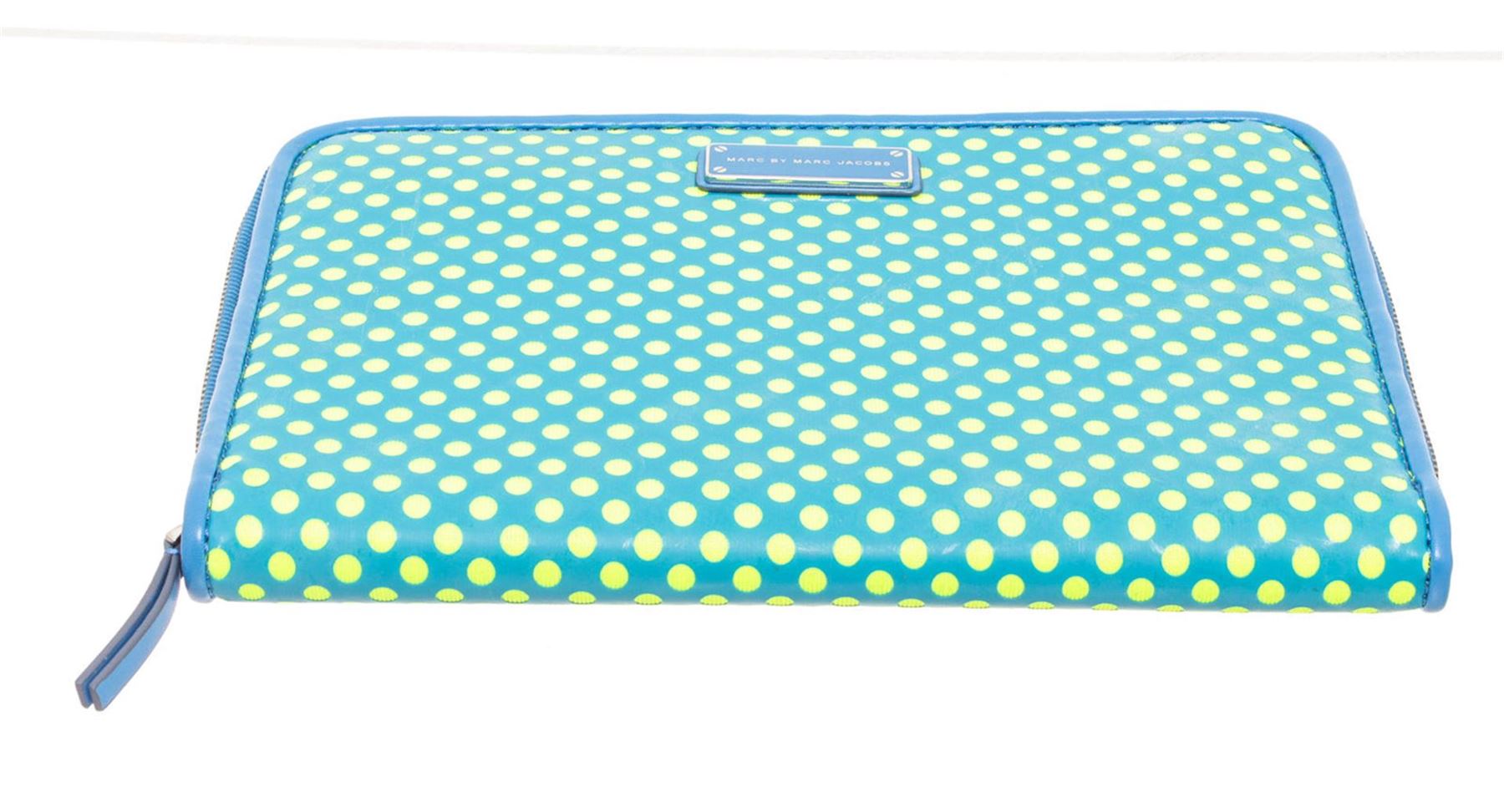 Marc By Marc Jacobs blue yellow leather dot tablet case with silver-tone hardware, logo placard at front, blue leather interior lining, tablet holder slot, one interior compartment and overall zip around closure.