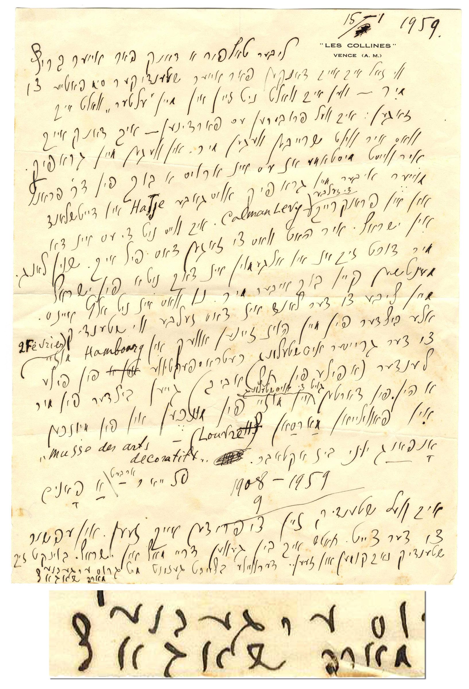 Marc Chagall autograph letter signed, dated 15 January 1959 on ''Les Collines / Vence'' letterhead. Letter is addressed to a Talpir in Tel-Aviv, a friend of Chagall's and editor of the Israeli art magazine ''Gazit.'' Reads in part: ''Dear Talpir, Thank you for your letter. How do I thank you for your continued fondness of me, If I wasn't my 'age' I would say: I will try to be worthy of it, thank you for wanting to write about me. You know that a book by Dr. Franz Maier about my work was published in Germany and in France by Kalman Levi. You have something to say, I feel it for a long time. Usually, I think, Israelis don't write about me, and its not the same. My love for Israel hasn't changed. All my paintings from home were sent to the Museum in Hamburg, for a retrospective exhibition… from there the exhibition moves to the Munich Museum and then to the Pavilion Marsan (Louvre) - 'Musee des art decoratifs' -- 1908-1959, 50 years of work, that's something…Yours truly, Marc Chagall''. Ink letter measures 8.25'' x 10.5'' on one page. Minor foxing throughout and small chip at bottom, else very good condition overall.