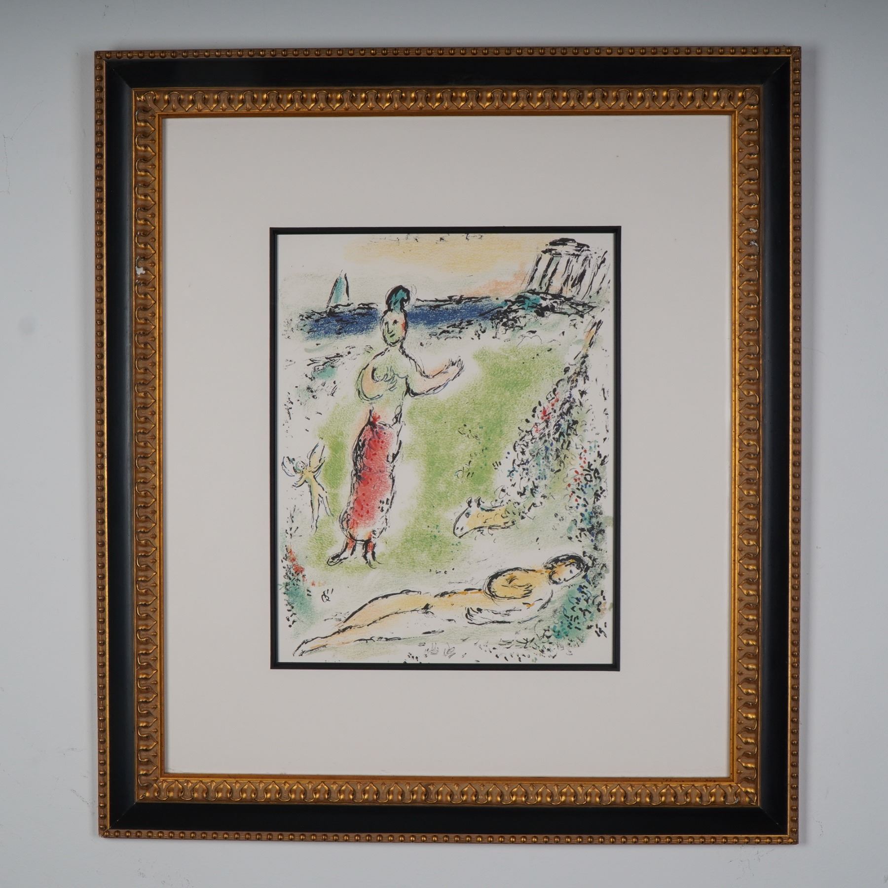 Radiant with mythological reverie and dreamlike whimsy, Athena Puts Odysseus to Sleep is a captivating offset color lithograph after Marc Chagall from his celebrated series Homer's Odyssey. The composition captures a tender, poetic moment from the epic: the goddess Athena watches over the sleeping Odysseus, protector and muse to the weary hero. Set against a backdrop of lush green fields and deep blue seas, the scene unfolds in a visual symphony of soft pastels and bold linework, with mythical figures drifting through the frame, a winged cherub, an ethereal horse, and the iconic reclining hero. This lithograph exemplifies Chagall's masterful ability to transform ancient tales into emotional dreamscapes. His use of color and fluid form bridges the timelessness of myth with the surreal lyricism of modern art. Rich with motion and allegory, it is a quintessential example of Chagall's literary illustrations. Presented in an ornate gold and ebony frame with a wide archival mat and elegant inner fillet, this work is ready for display and admiration.