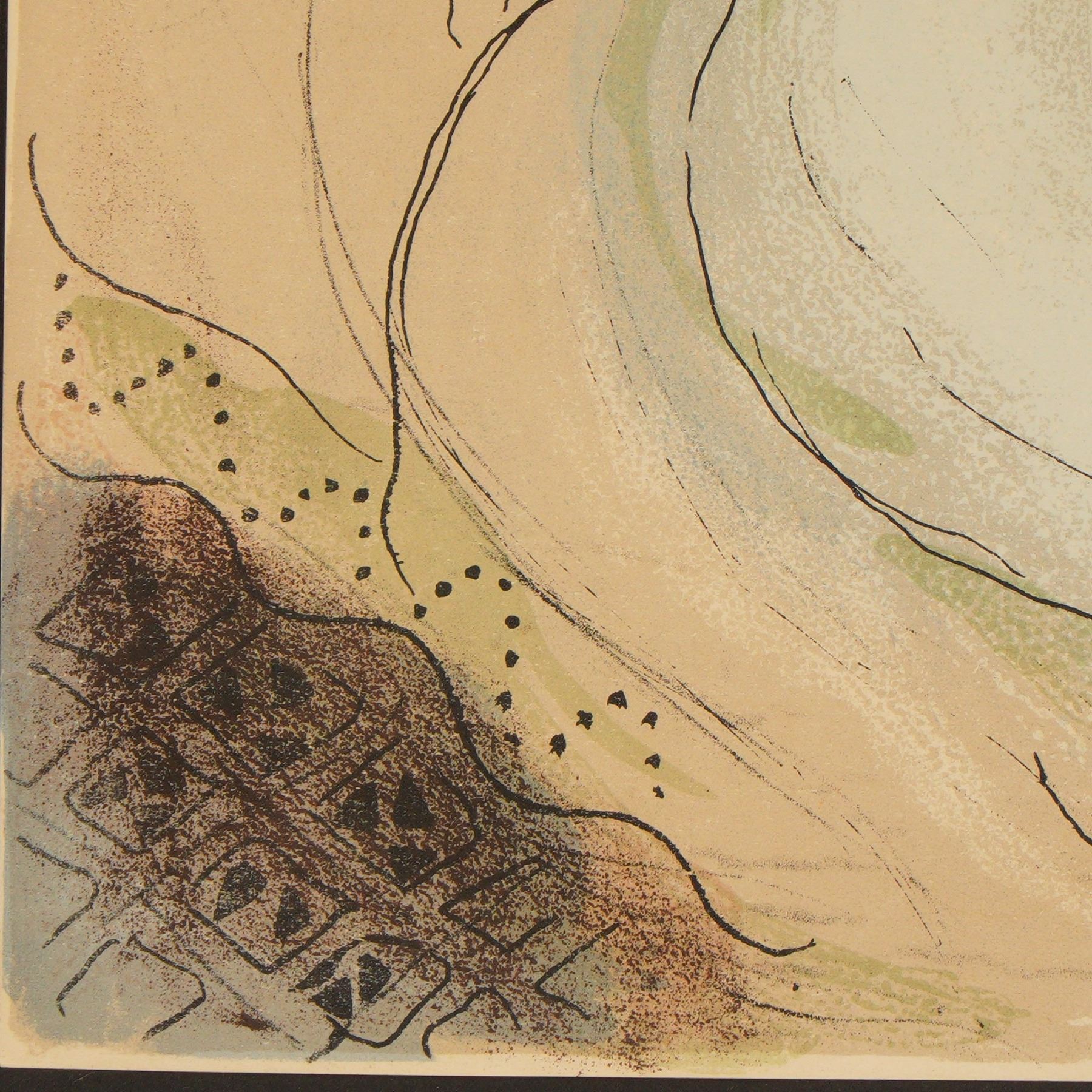 Experience the mysticism and spiritual lyricism of Marc Chagall with this stunning offset color lithograph titled Sarah and Abimelech, after the master's celebrated Bible Lithographs series from 1960. Rendered with Chagall's signature dreamlike aesthetic, this exquisite piece vividly reimagines the biblical story in which King Abimelech, warned by a divine messenger, refrains from taking Sarah as his wife. In Chagall's poetic hand, the moment is suffused with reverence, emotion, and transcendent beauty. The composition is rich with visual symbolism: Sarah and the bearded king are portrayed with soft, flowing lines and intimate expressions, while a red-hued angel looms above, casting divine judgment and ethereal presence. The delicate layering of pastel tones with deep ink lines showcases the artist's extraordinary ability to blend narrative with fantasy. The textures and palette echo Chagall's faith-infused palette of love, memory, and spiritual fervor. Housed in an ornate gold gilt frame with a nameplate inscribed Marc Chagall 1887-1985, this lithograph is a breathtaking tribute to the artist's lifelong fascination with biblical themes and storytelling.