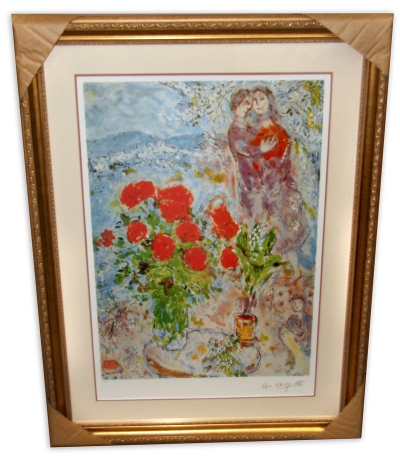 Marc Chagall (After) 'Red Bouquet with Lovers' Framed & Matted