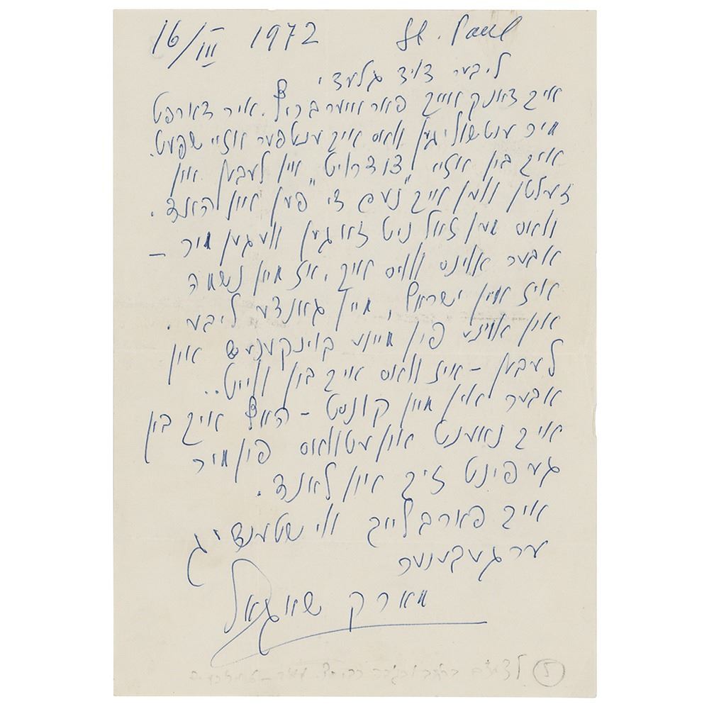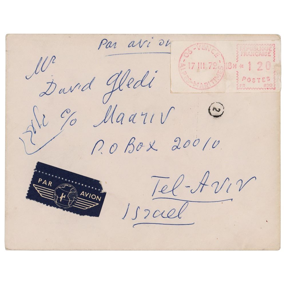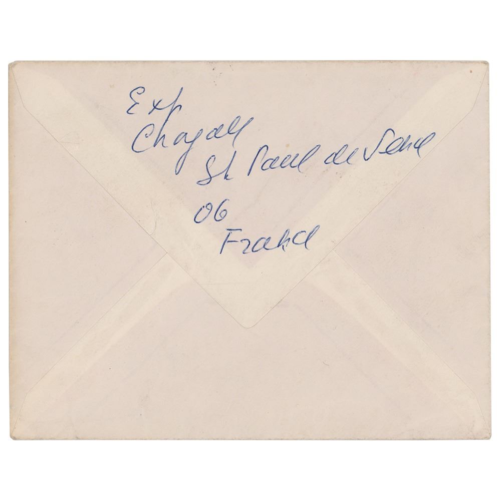 ALS in Yiddish, one page, 5.75 x 8.25, March 16, 1972. Addressed from Saint Paul de Vence in France, a handwritten letter to Israeli journalist and writer David Giladi, in full (translated): "My gratitude extends to you for your letter. You must forgive me that my answer was late. I’m not at my best, and the days when I hold a pen in my hand are rare. Everything they said about me—one I knew: my soul is in Israel—my loved. In one of the changes in my life and around me, that I am far away, but I hope that in my art I am close, and something of me is in Israel.” In fine condition. Accompanied by the original mailing envelope addressed by Chagall, who incorporates his signature on the reverse flap.