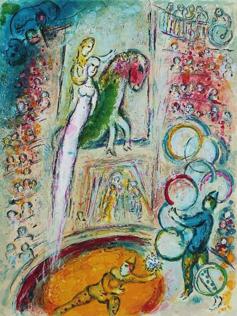 Artist: Marc Chagall - Title: Circus IV - Medium: Fine Art Giclee on Paper - Signature: Facsimile Signed - Limited Edition: 375 - Image Size: Approximately 19 inches x 14.75 inches - Paper Size: Approximately 23.5 inches x 17 inches - Framed: Unframed - Biography: One of the greatest names in the history of art is Marc Chagall. Born in old Czarist Russia in 1887, he lived to the ripe old age of 98. His passing came in his adopted home in Paris. Chagall's story begins with the Primitivist Movement of the turn of the century. He moved to Paris in 1910, where he studied the masters Cezanne, Van Gogh and Paul Gauguin. Drawn to the excitement of the Russian Revolution, he returned to Russia in 1914 and founded the Constructionist School in 1917. - After two years of intense controversy and artistic conflict, Chagall returned to a dreamy fairy tale art form that is the modern forerunner of Traditional Surrealism. His grandest showing is at the Hermitage in St. Petersburg, Russia, the largest art museum on earth. He is displayed at the most important museums without exception. His original oils bring millions of dollars art auction. His signed and numbered graphics command tens of thousands. -