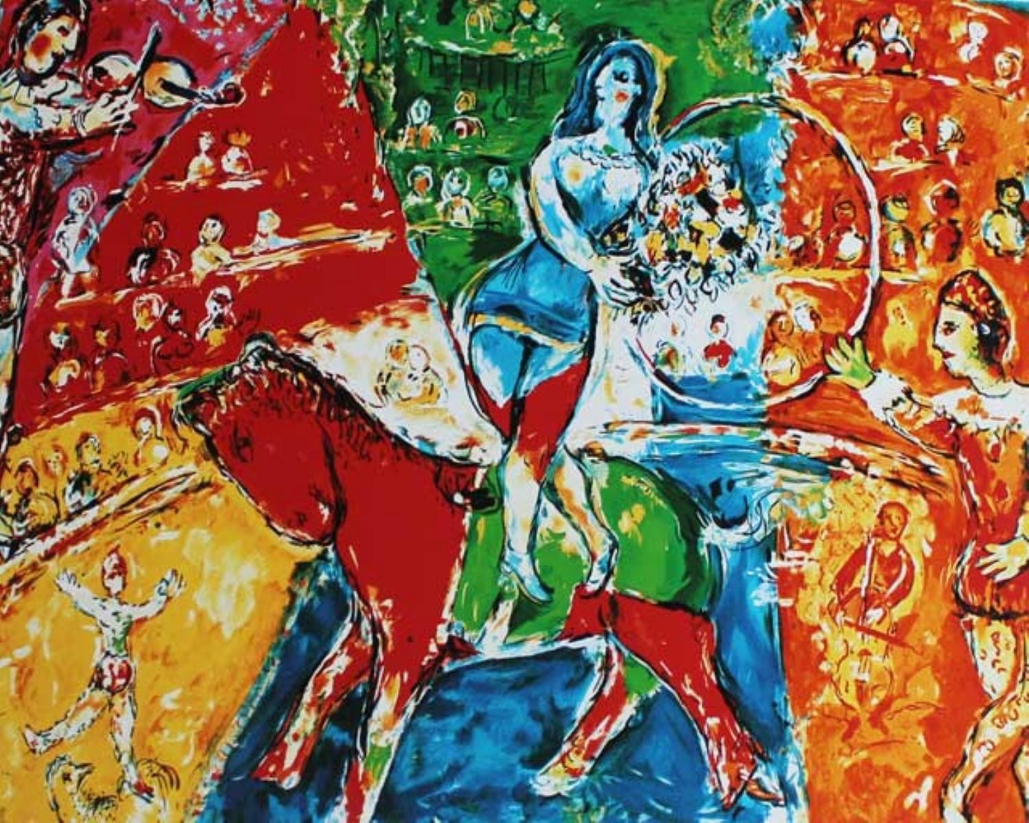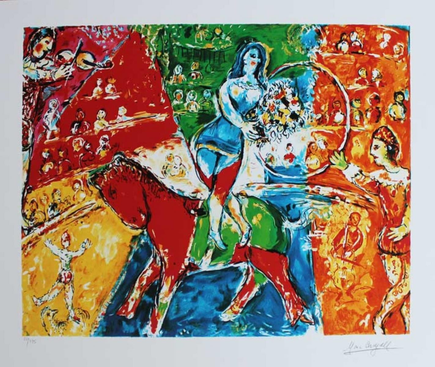 Artist: Marc Chagall - Title: Circus with Horse and Rider - Medium: Fine Art Giclee on Paper - Signature: Facsimile Signed - Limited Edition: 375 - Image Size: Approximately 14 inches x 18 inches - Paper Size: Approximately 18 inches x 20.25 inches - Framed: Unframed - Biography: One of the greatest names in the history of art is Marc Chagall. Born in old Czarist Russia in 1887, he lived to the ripe old age of 98. His passing came in his adopted home in Paris. Chagall's story begins with the Primitivist Movement of the turn of the century. He moved to Paris in 1910, where he studied the masters Cezanne, Van Gogh and Paul Gauguin. Drawn to the excitement of the Russian Revolution, he returned to Russia in 1914 and founded the Constructionist School in 1917. - After two years of intense controversy and artistic conflict, Chagall returned to a dreamy fairy tale art form that is the modern forerunner of Traditional Surrealism. His grandest showing is at the Hermitage in St. Petersburg, Russia, the largest art museum on earth. He is displayed at the most important museums without exception. His original oils bring millions of dollars art auction. His signed and numbered graphics command tens of thousands. -