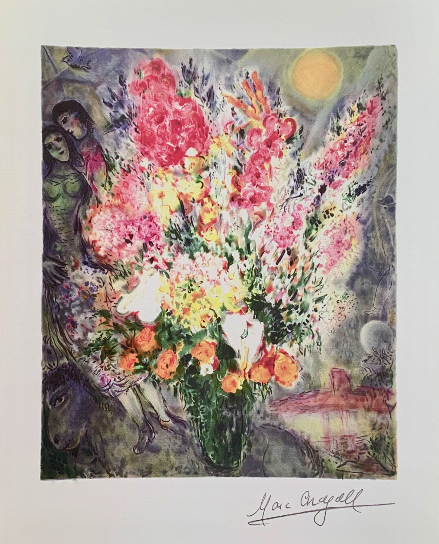 This is a Marc Chagall limited edition giclee titled FLORAL BOUQUET. This subject is facsimile signed which means it has a copy of Chagall’s signature. Numbered from a limited edition of 375. Image measures 9.5 inches x 12 inches. Sheet with border measures 12 inches x 16 inches. Printed on high quality archival paper with generous margins. Bright and fresh with rich colors; never mounted, matted or framed. Comes with a certificate. In mint condition.
