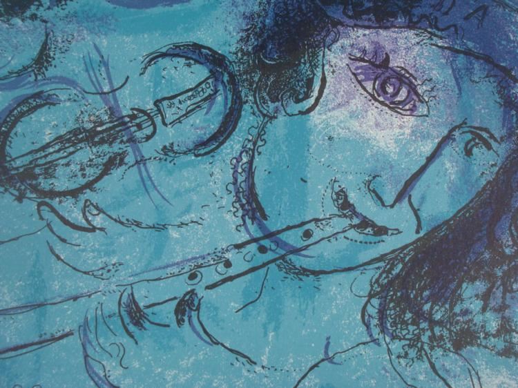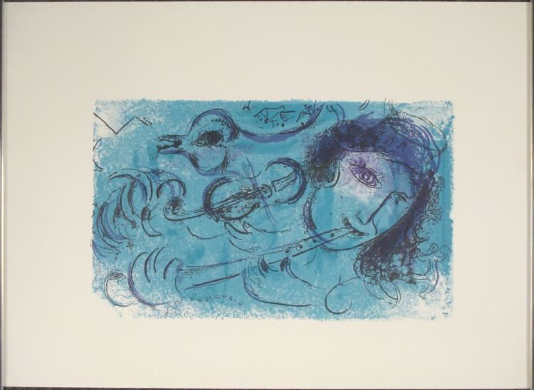 This is a portrait of a flutist all in blue, with a dreamy composition. Artist: Marc Chagall Title: Blue FluteMedium: Print on paperSheet size: 16 3/4 x 23 inchesCondition: Excellent