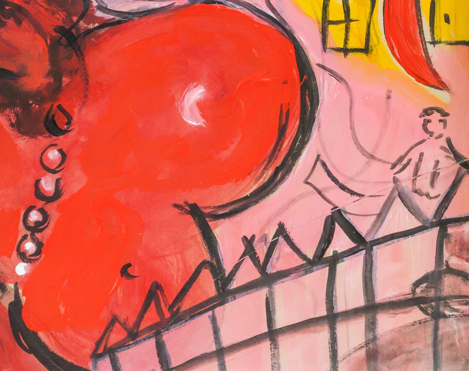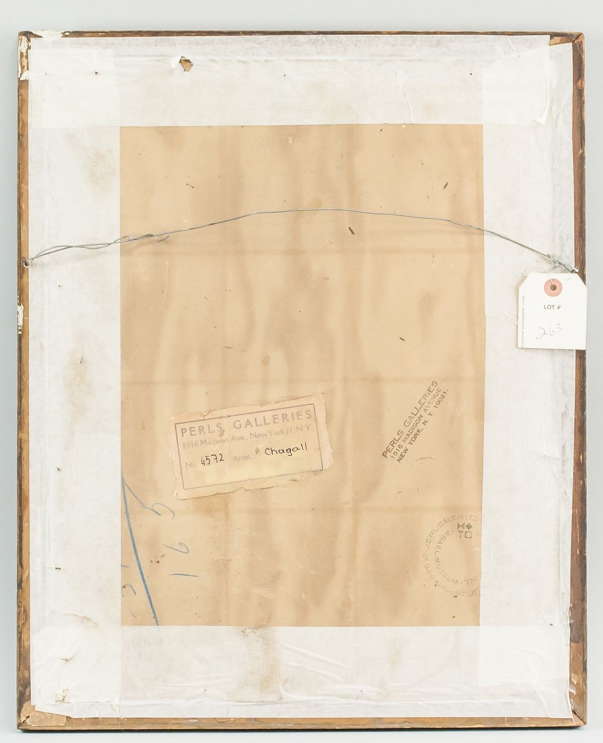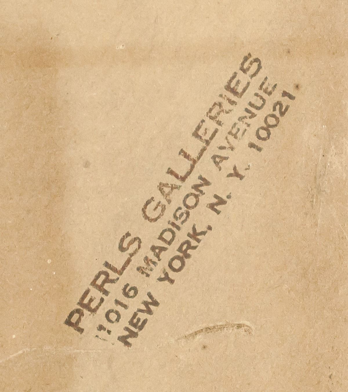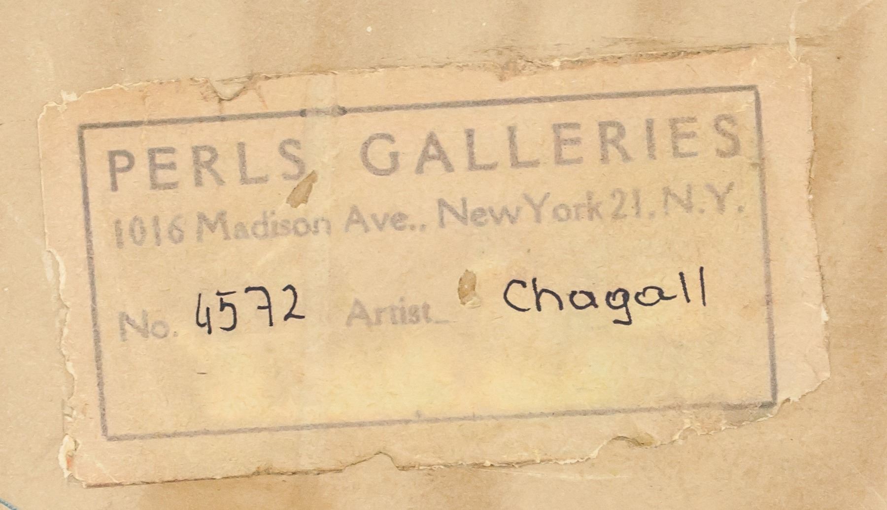 Gouache on paper, framed. Featuring a surrealist portrait scene. Signed chAgAll MArc on the lower edge. Inscribed on verso. Gallery label inscribed PERLS GALLERIES / 1016 Madison Ave., New York 21.N.Y. / No. 4572 / Artist Chagall on verso. PERLS GALLERIES / 1016 MADISON AVENUE / NEW YORK, N. Y. 10021 stamped on verso. Lot tag inscribed LOT # 263 suspended on frame. Attributed to Marc Chagall (1887-1985, Russian-French). 50 x 39 cm (19.5 x 15.5 inches). Frame: 55 x 45 cm (21.75 x 17.75 inches). Provenance: This lot carries limited provenance from a Southern Italian estate