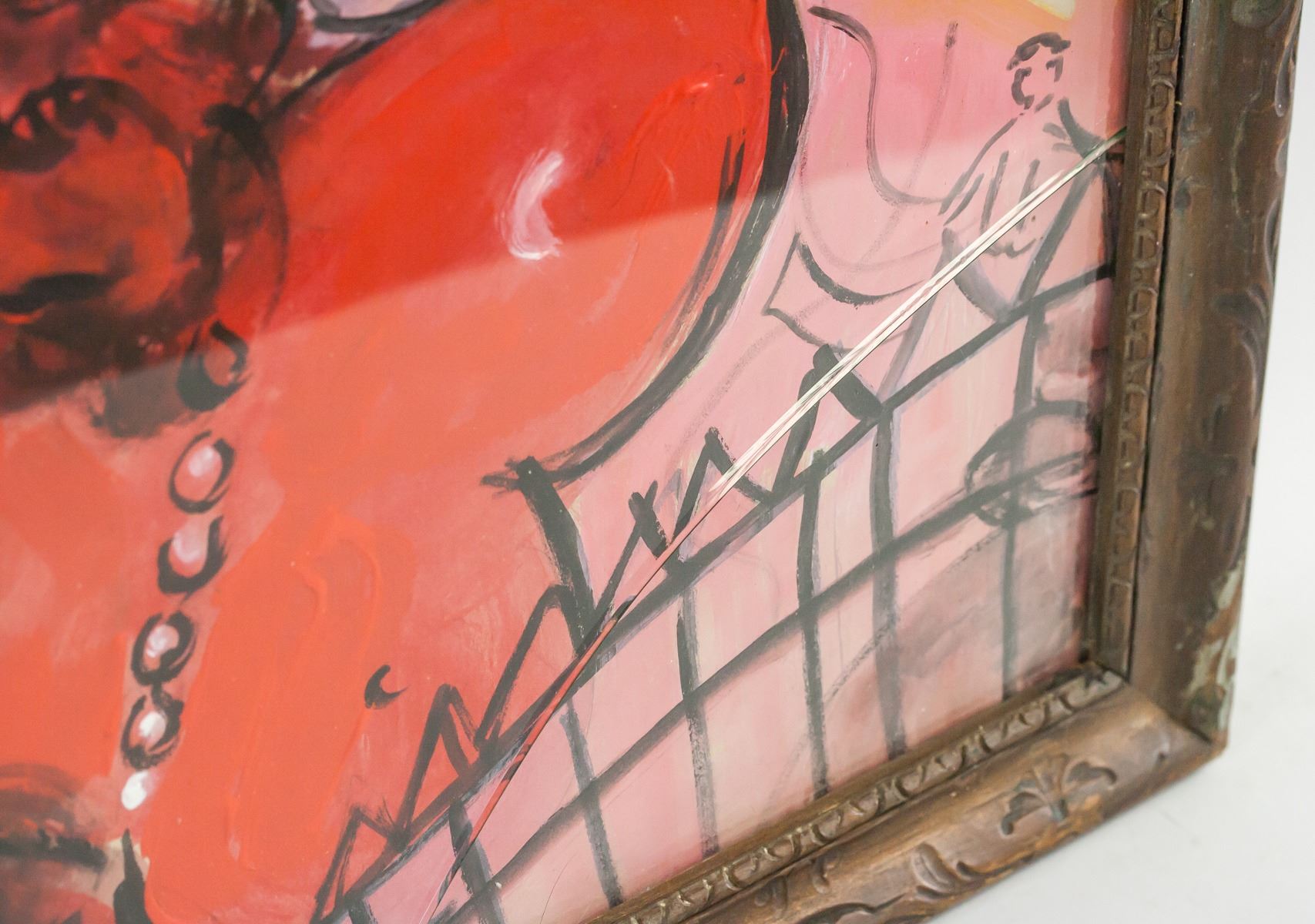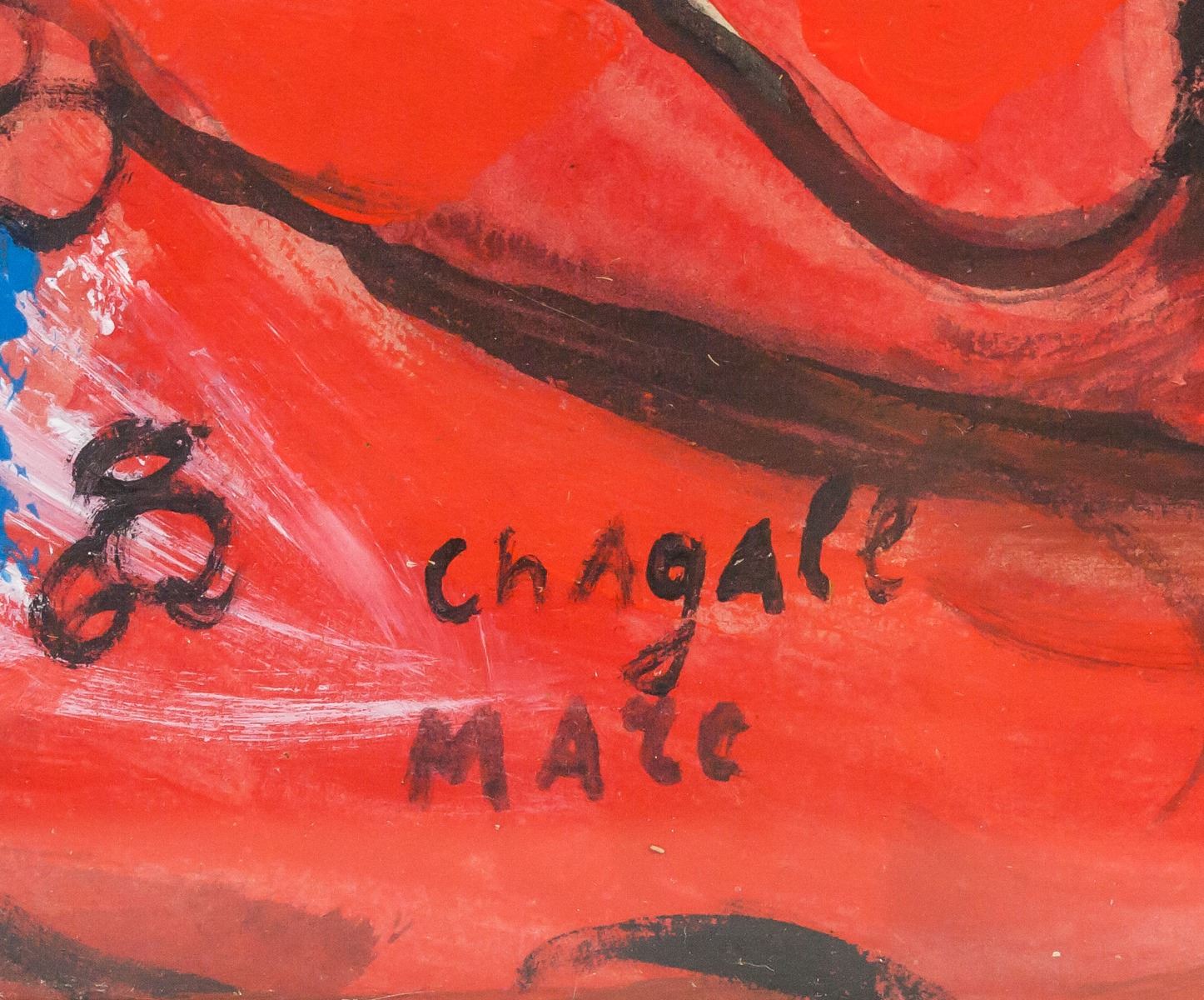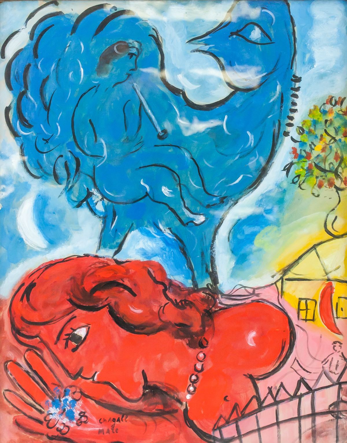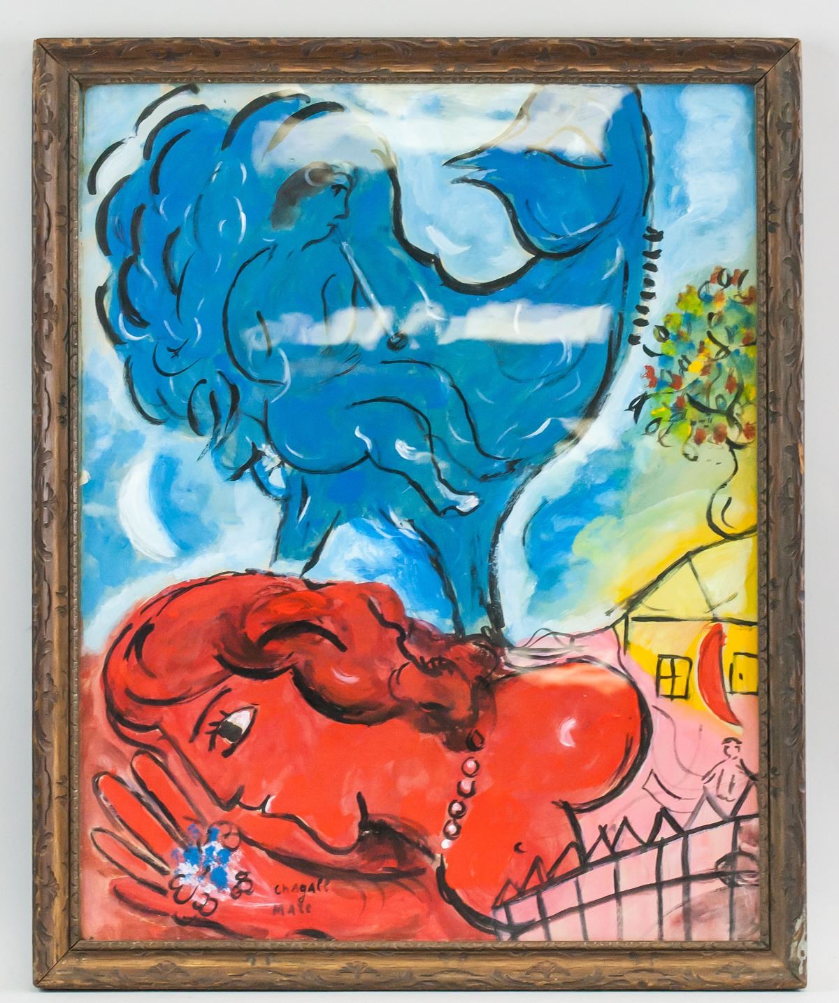 Gouache on paper, framed. Featuring a surrealist portrait scene. Signed chAgAll MArc on the lower edge. Inscribed on verso. Gallery label inscribed PERLS GALLERIES / 1016 Madison Ave., New York 21.N.Y. / No. 4572 / Artist Chagall on verso. PERLS GALLERIES / 1016 MADISON AVENUE / NEW YORK, N. Y. 10021 stamped on verso. Lot tag inscribed LOT # 263 suspended on frame. Attributed to Marc Chagall (1887-1985, Russian-French). 50 x 39 cm (19.5 x 15.5 inches). Frame: 55 x 45 cm (21.75 x 17.75 inches). Provenance: This lot carries limited provenance from a Southern Italian estate