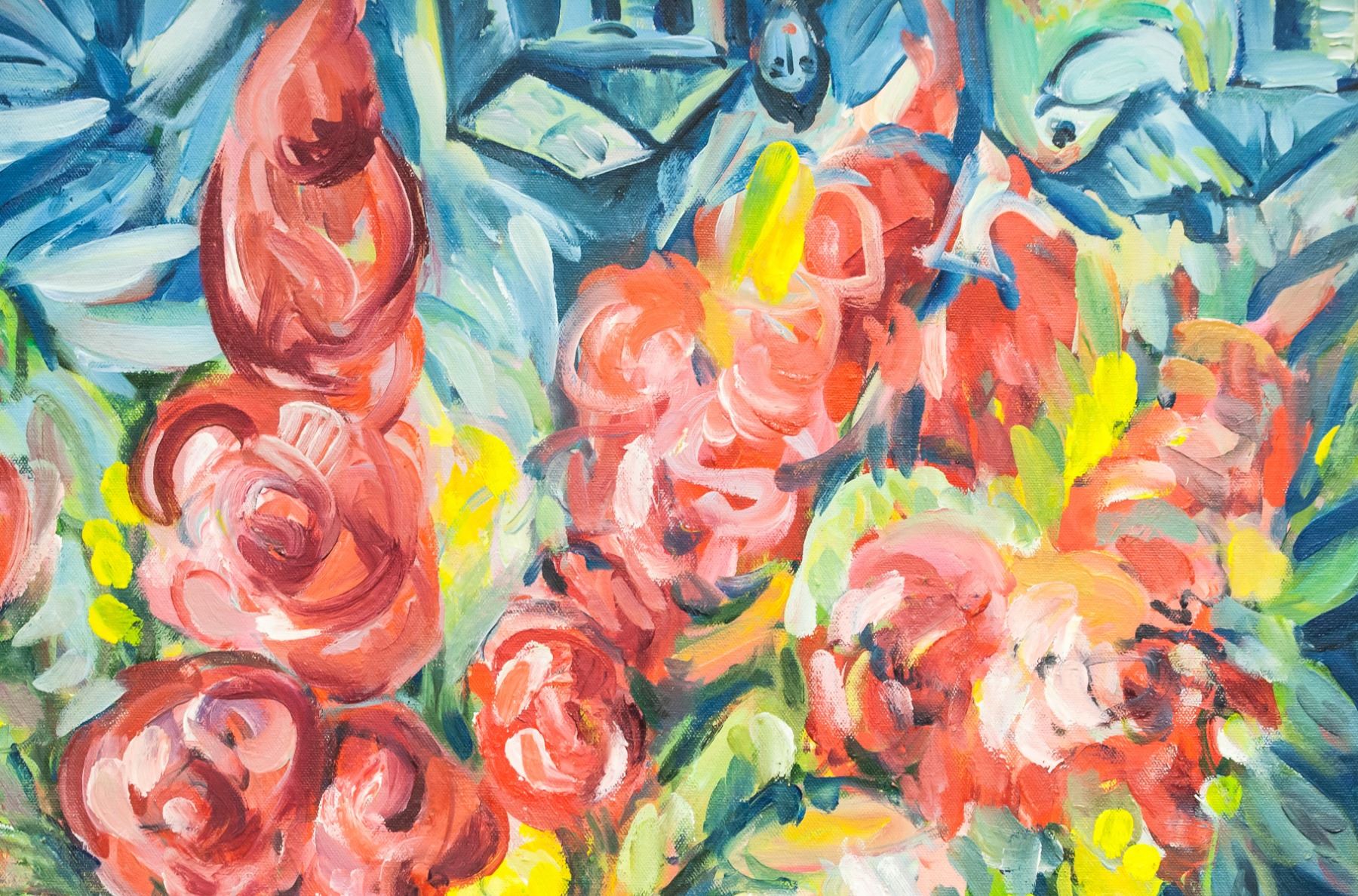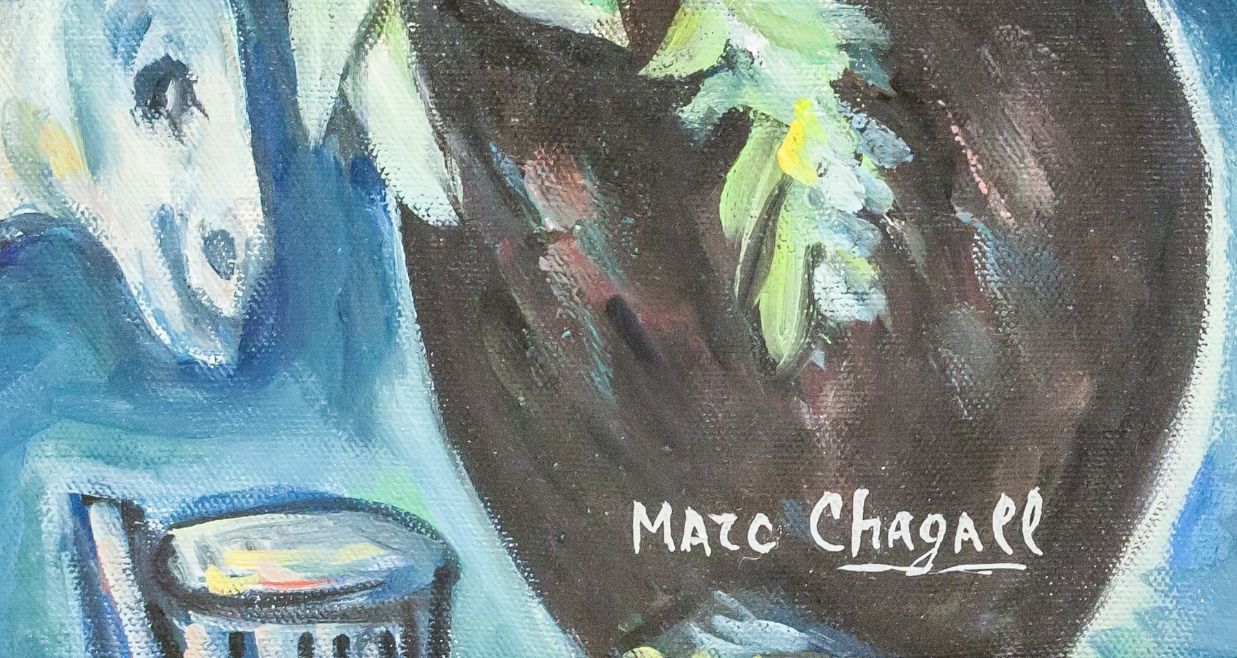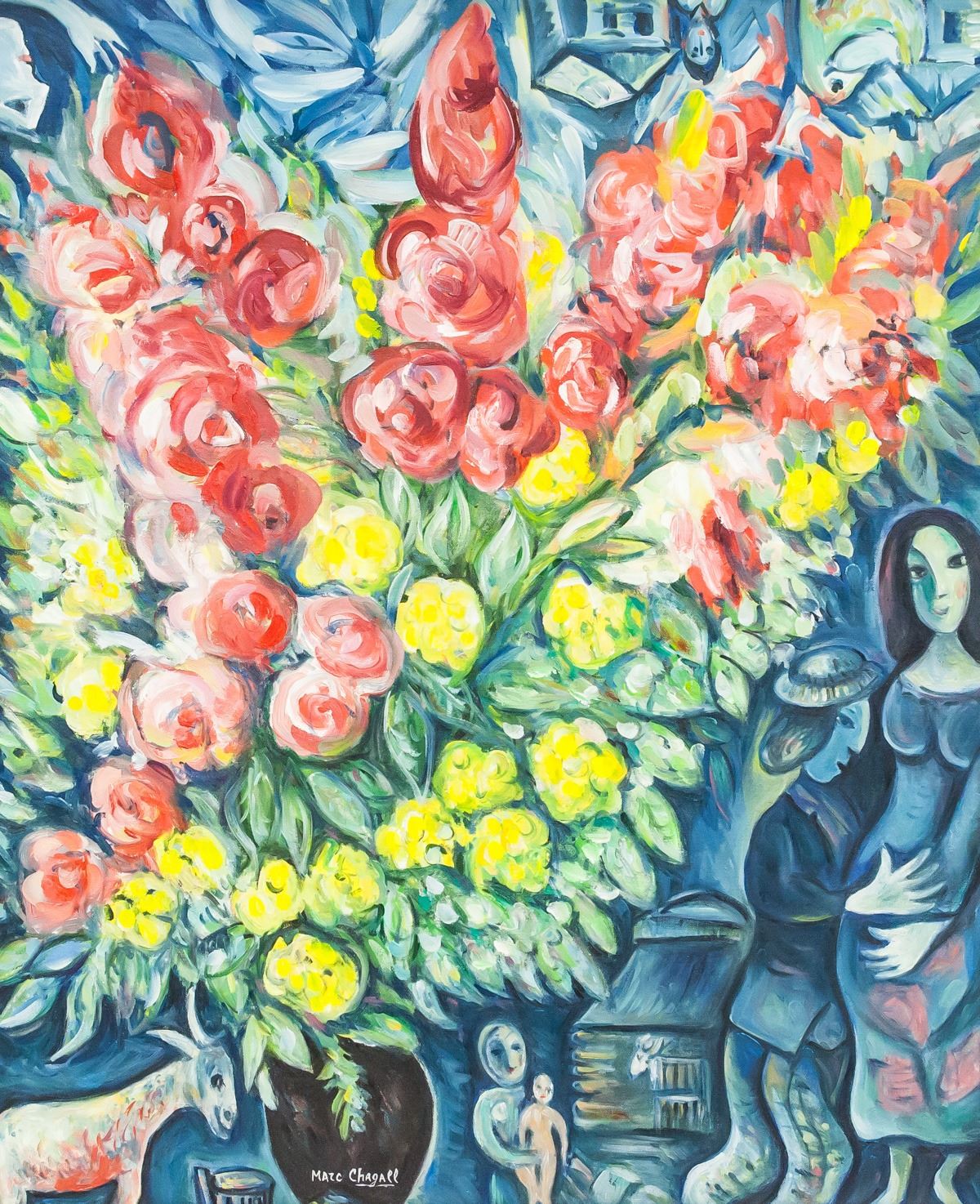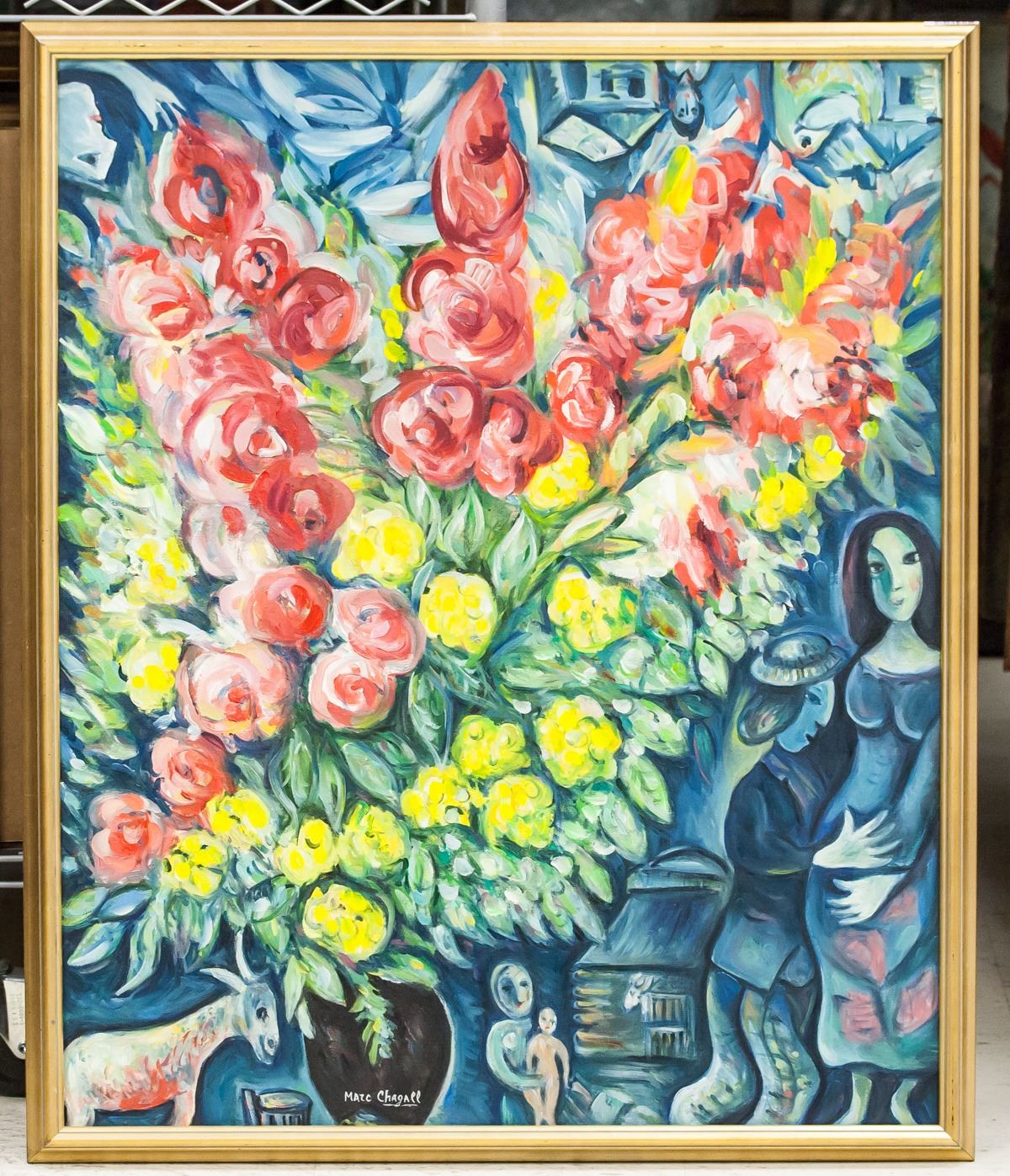Oil on canvas, framed. Featuring surrealist composition of a large bouquet of flowers in a vase in the center. Signed "Marc Chagall" to the bottom left. Attributed to Marc Chagall (1887-1985, Russian-French). Frame size: 94 x 79 cm (37 x 31 in). Provenance: This lot carries limited provenance from a Toronto estate