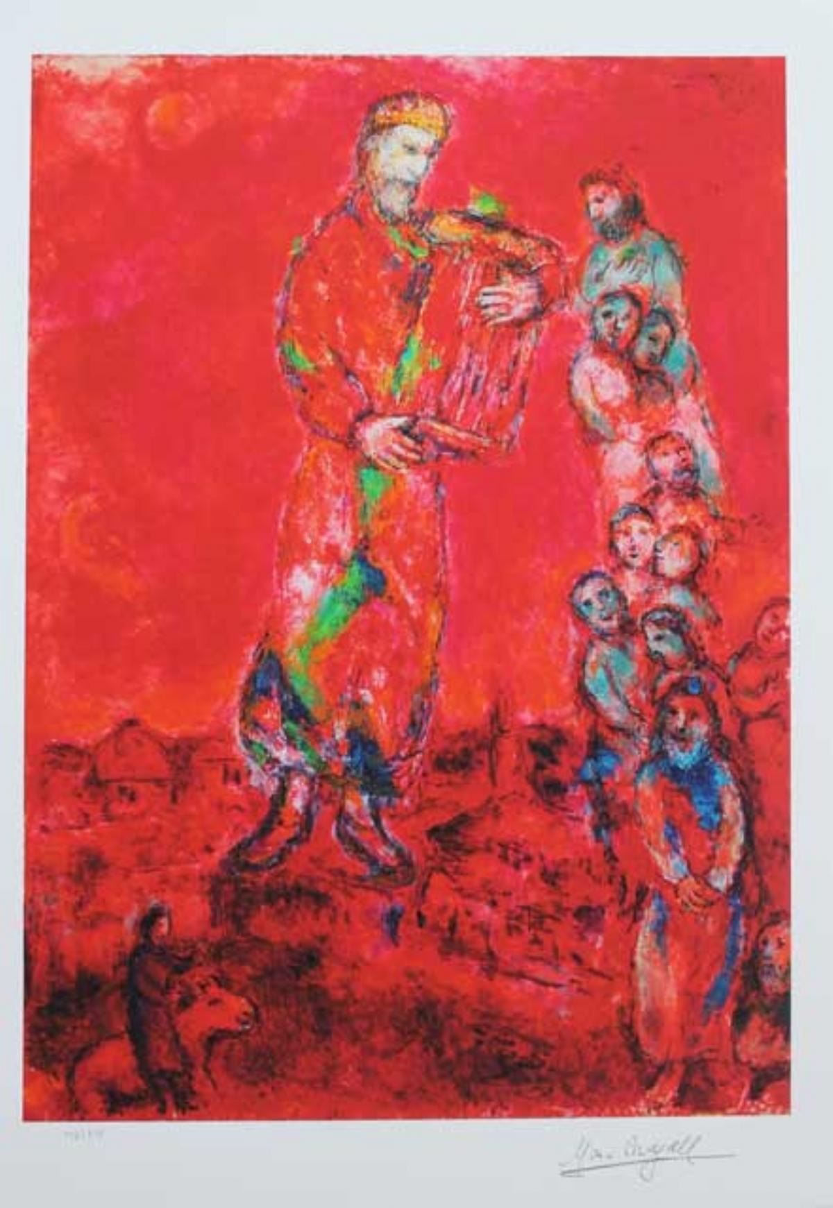 Artist: Marc Chagall - Title: King David with Lyre - Medium: Fine Art Giclee on Paper - Signature: Facsimile Signed - Limited Edition: 375 - Image Size: Approximately 19.5 inches x 13.25 inches - Paper Size: Approximately24 inches x 15.5inches - Unframed - Biography: One of the greatest names in the history of art is Marc Chagall. Born in old Czarist Russia in 1887, he lived to the ripe old age of 98. His passing came in his adopted home in Paris. Chagall's story begins with the Primitivist Movement of the turn of the century. He moved to Paris in 1910, where he studied the masters Cezanne, Van Gogh and Paul Gauguin. Drawn to the excitement of the Russian Revolution, he returned to Russia in 1914 and founded the Constructionist School in 1917. - After two years of intense controversy and artistic conflict, Chagall returned to a dreamy fairy tale art form that is the modern forerunner of Traditional Surrealism. His grandest showing is at the Hermitage in St. Petersburg, Russia, the largest art museum on earth. He is displayed at the most important museums without exception. His original oils bring millions of dollars art auction. His signed and numbered graphics command tens of thousands. -