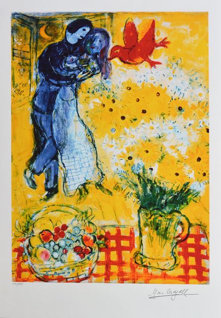 Artist: Marc Chagall - Title: Lovers with Daises - Medium: Fine Art Giclee on Paper - Signature: Facsimile Signed - Limited Edition: 375 - Image Size: Approximately 20 inches x 13 inches - Paper Size: Approximately 24.25 inches x 15 inches - Framed: Unframed - Biography: One of the greatest names in the history of art is Marc Chagall. Born in old Czarist Russia in 1887, he lived to the ripe old age of 98. His passing came in his adopted home in Paris. Chagall's story begins with the Primitivist Movement of the turn of the century. He moved to Paris in 1910, where he studied the masters Cezanne, Van Gogh and Paul Gauguin. Drawn to the excitement of the Russian Revolution, he returned to Russia in 1914 and founded the Constructionist School in 1917. - After two years of intense controversy and artistic conflict, Chagall returned to a dreamy fairy tale art form that is the modern forerunner of Traditional Surrealism. His grandest showing is at the Hermitage in St. Petersburg, Russia, the largest art museum on earth. He is displayed at the most important museums without exception. His original oils bring millions of dollars art auction. His signed and numbered graphics command tens of thousands. -