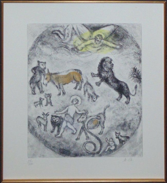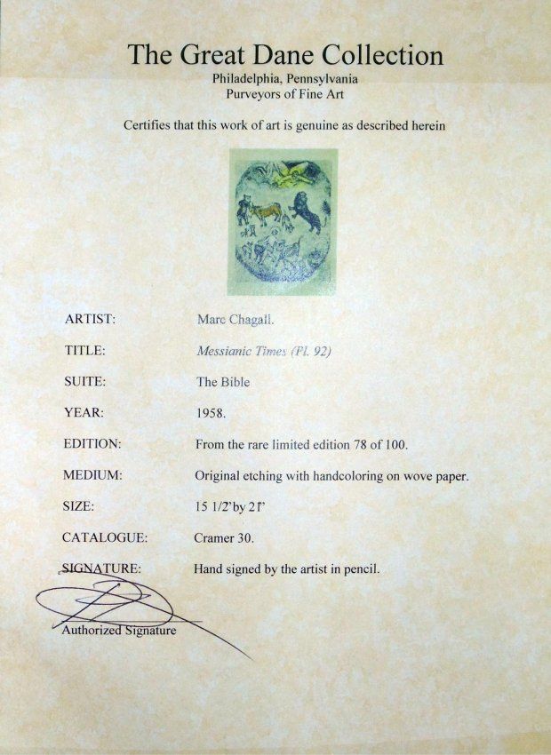Marc Chagall "Messianic Times (Pl. 92)" from the Suite "The Bible". Original etching with handcoloring on wove paper. Size: 15.5" x 21" Year: 1958 Edition: from the rare limited edition of 100. Hand signed by the artist in pencil. Comes with COA and framed. WN15750