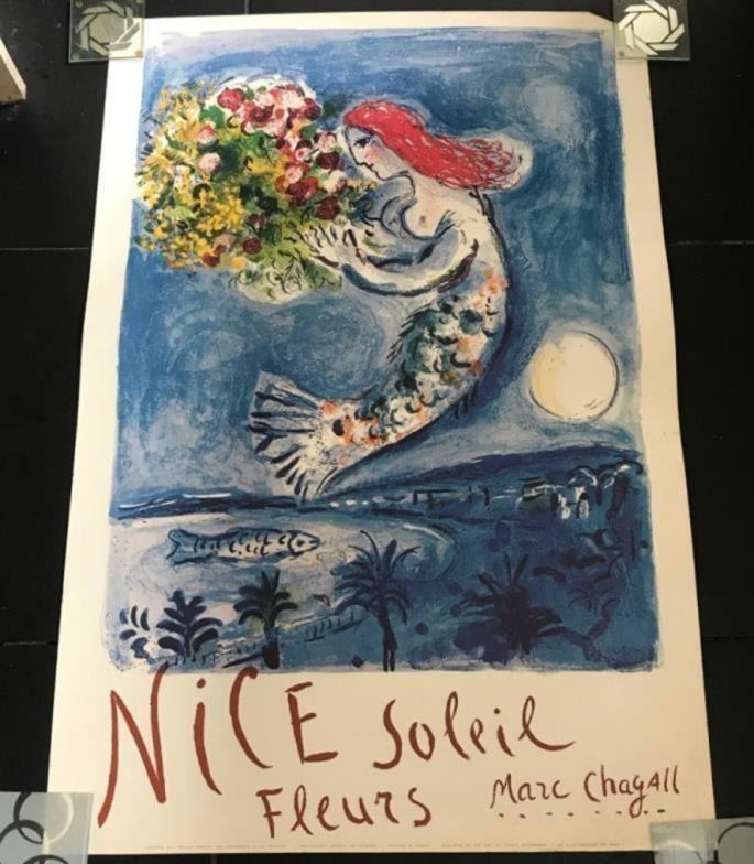French lithographic travel poster. Depicts a Mermaid floating in the sky with a bouquet of flowers. Published by and for the French government. Size: 38x25.5 inches.