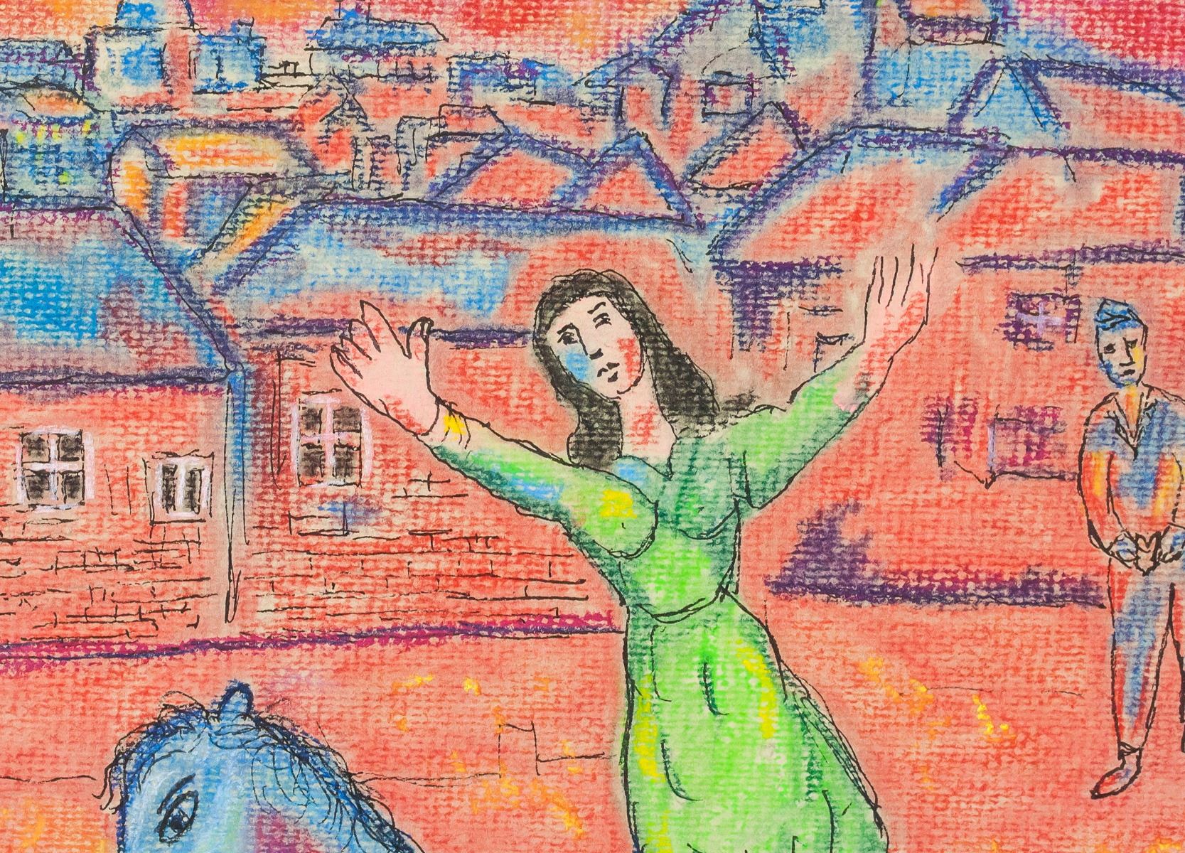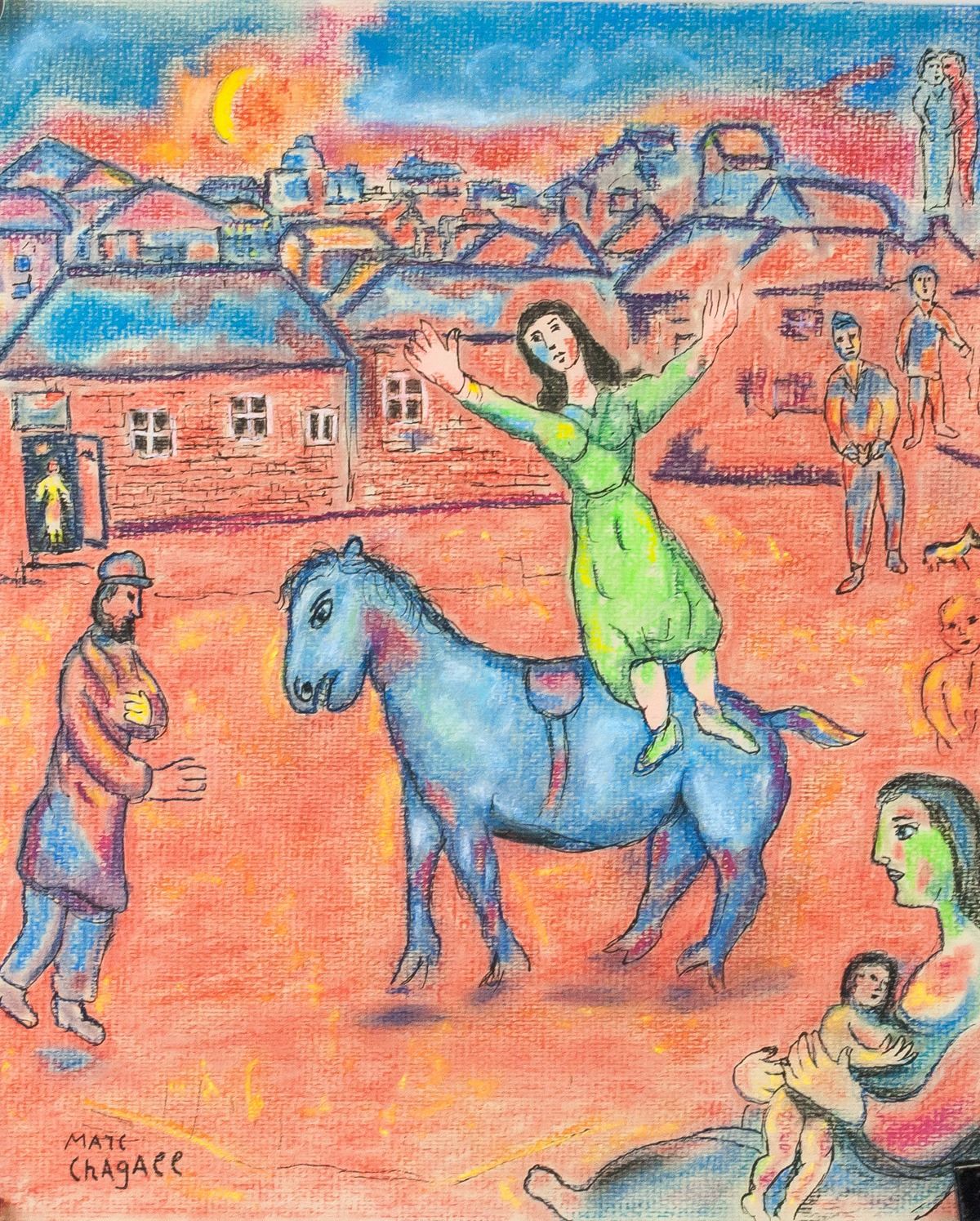 Pastel on paper. Featuring a surrealist scene with figures and rider floating above horse. Signed Marc ChAgAll on the lower left corner. Attributed to Marc Chagall (1887-1985, Russian-French). 37 x 30 cm (14.5 x 12 in). Provenance: This lot carries limited provenance from a Southern Ontario estate