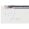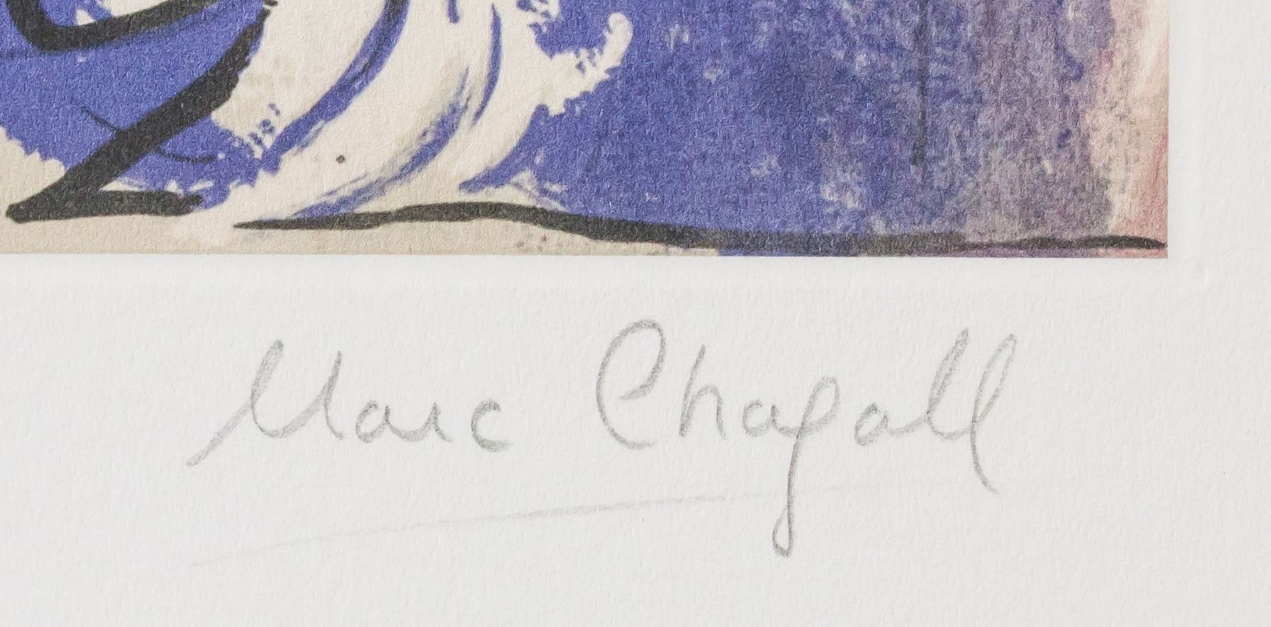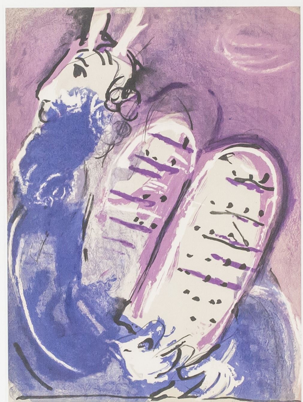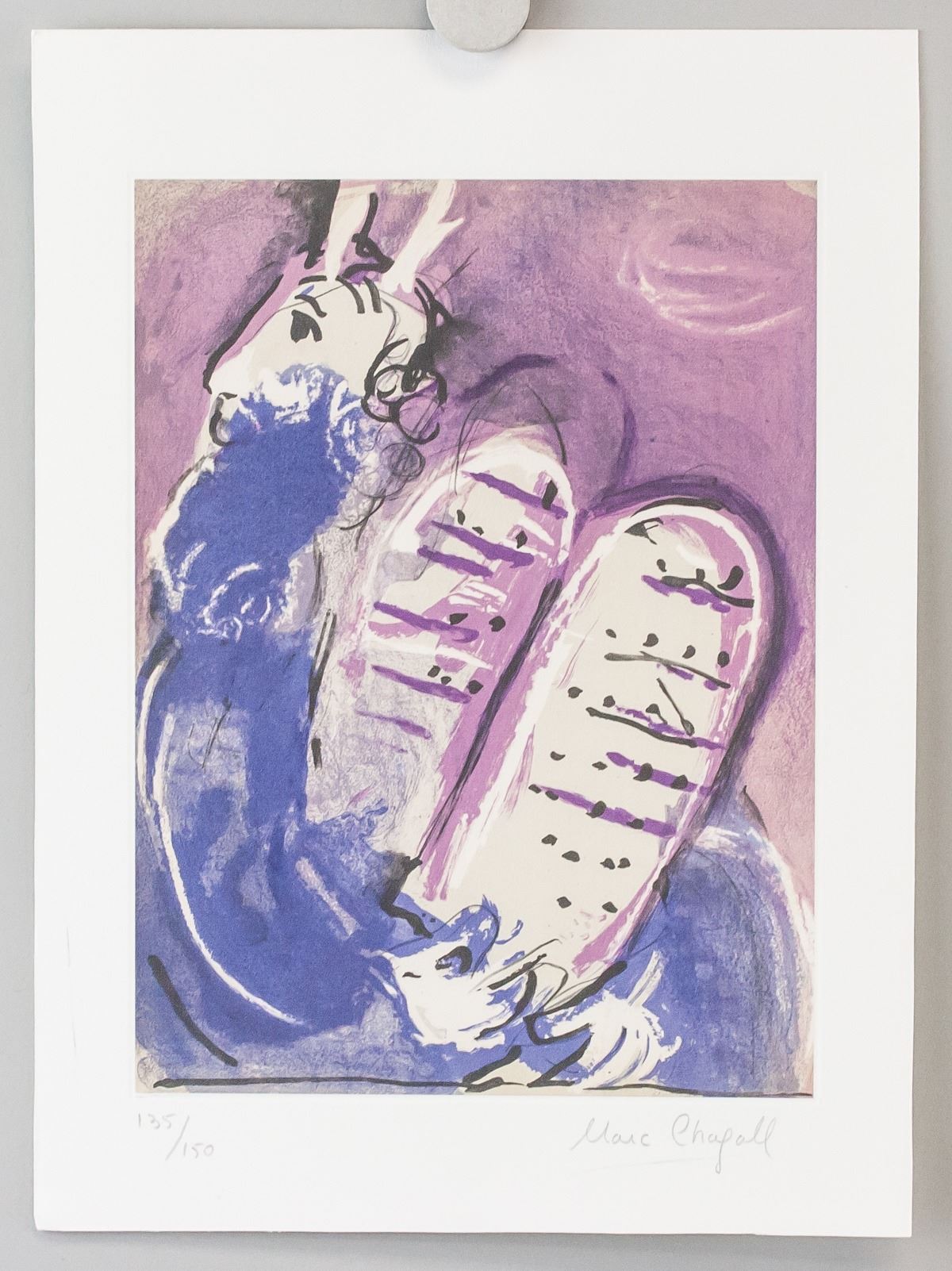 Linocut on paper. Featuring Moses holding two tablets inscribed with the Ten Commandants. Inscribed with "135/150" beneath the bottom left corner of the image. Signed "Marc Chagall" beneath the bottom right corner of the image. Attributed to Marc Chagall (1887-1985, Russian-French). Plate size: 22 x 16 cm (8.5 x 6.25 inches). Paper size: 29 x 21 cm (11.5 x 8.25 inches). Provenance: This lot carries limited provenance from a Southern Ontario estate.