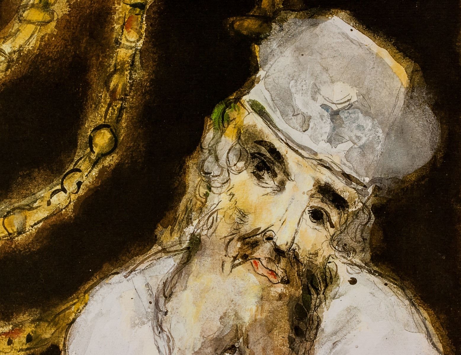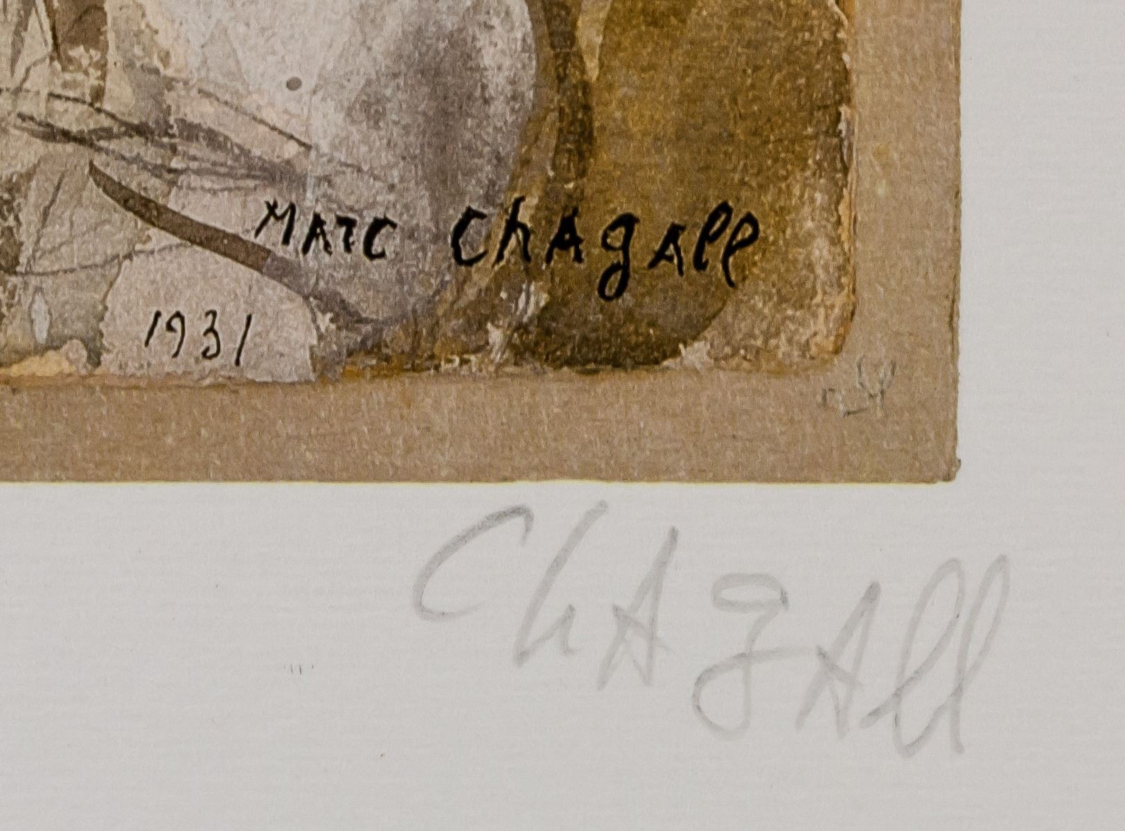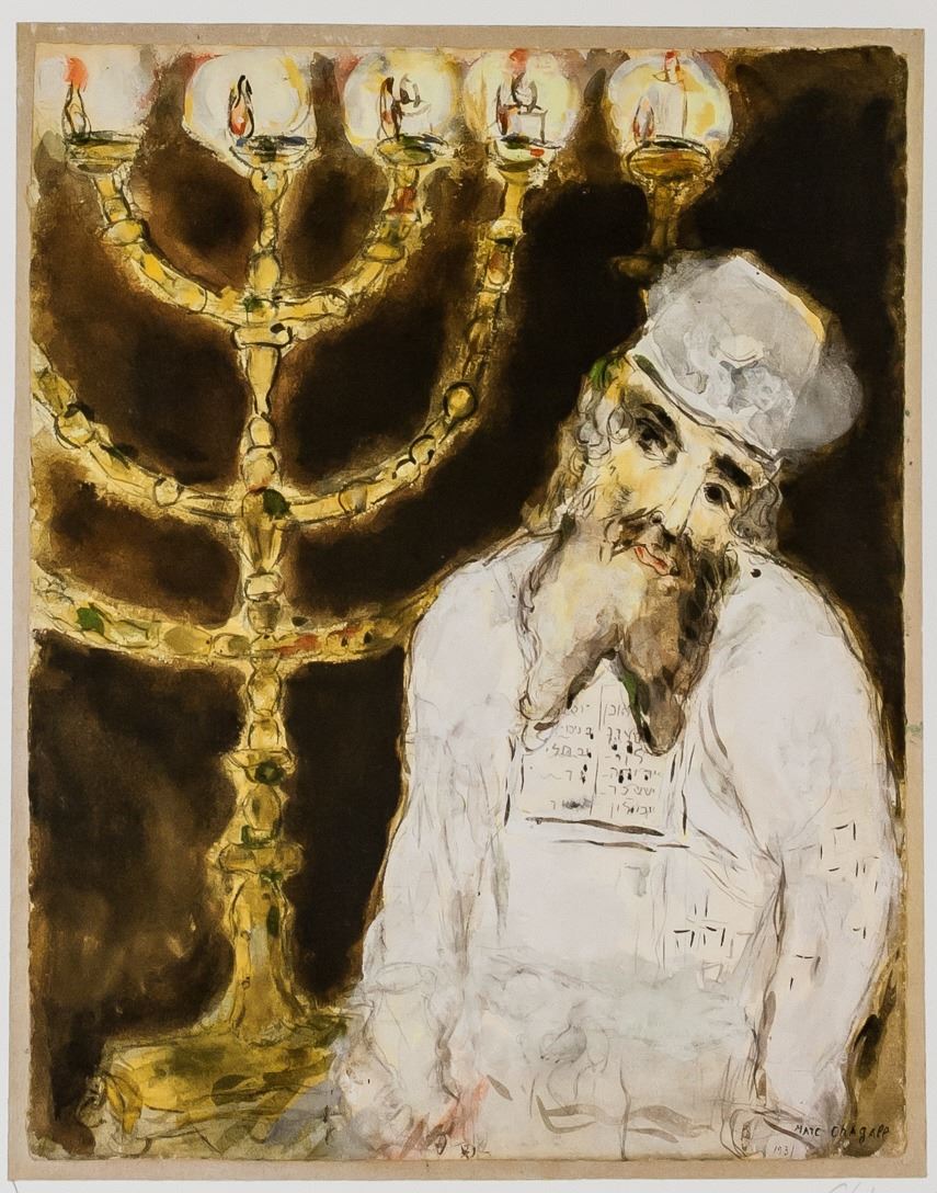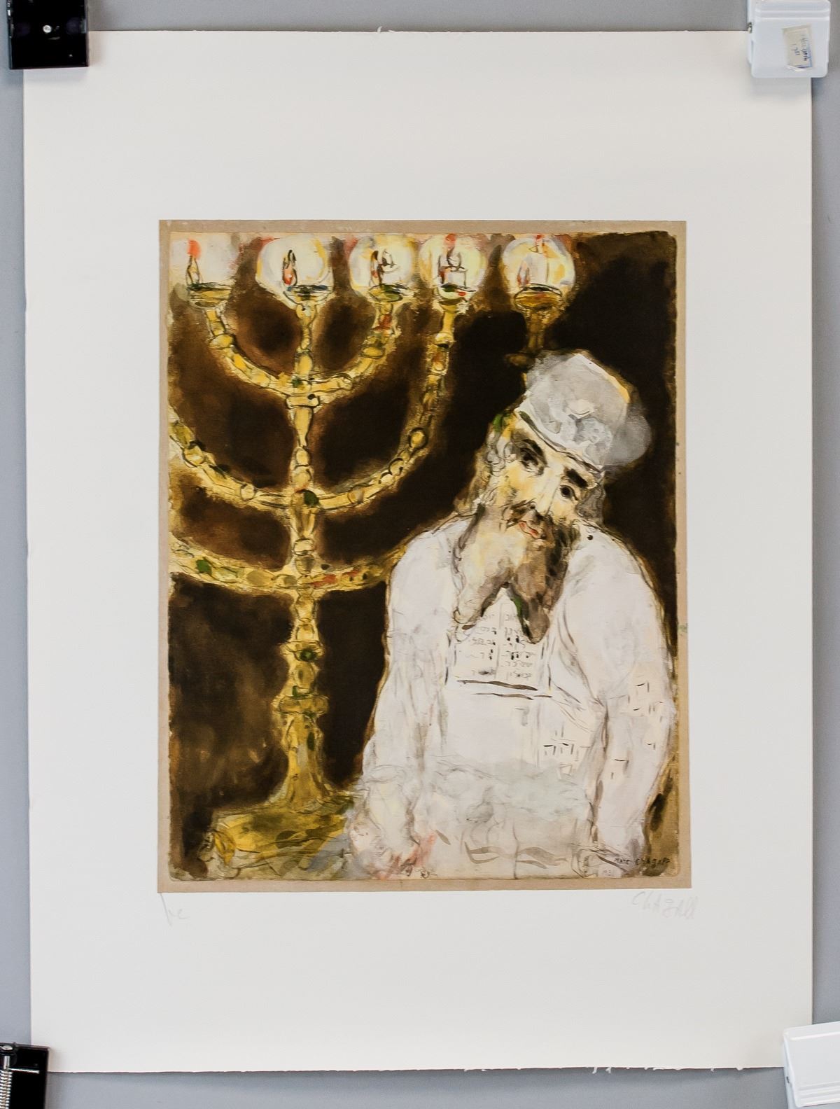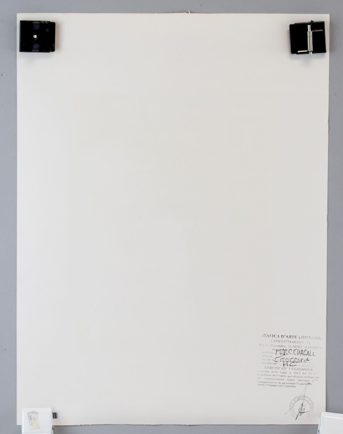 Lithograph on paper. Featuring a man in white standing next to a Menorah. Signed "Chagall" to the bottom right, with ""he" inscribed to the bottom left. Certification stamp on verso along with stamp reading "GRAFICA D'ARTS LOMBARDI". Attributed to Marc Chagall (1887-1985, Russian-French). 49 x 37 cm (19.25 x 14.5 in).