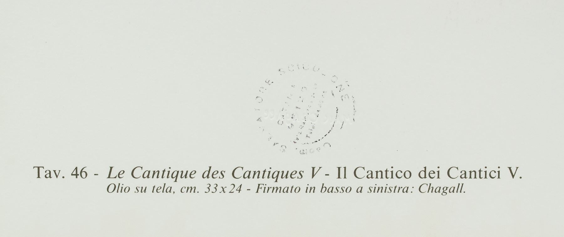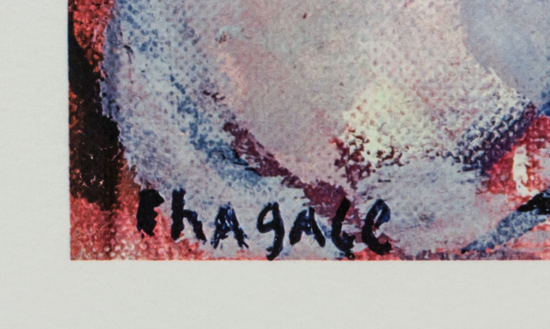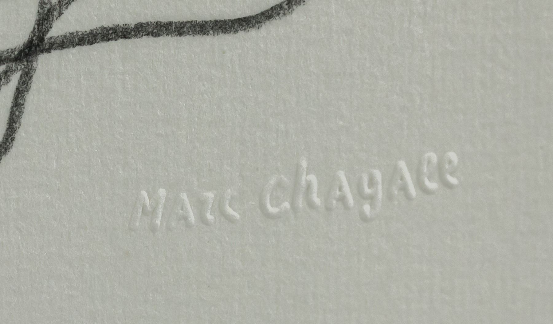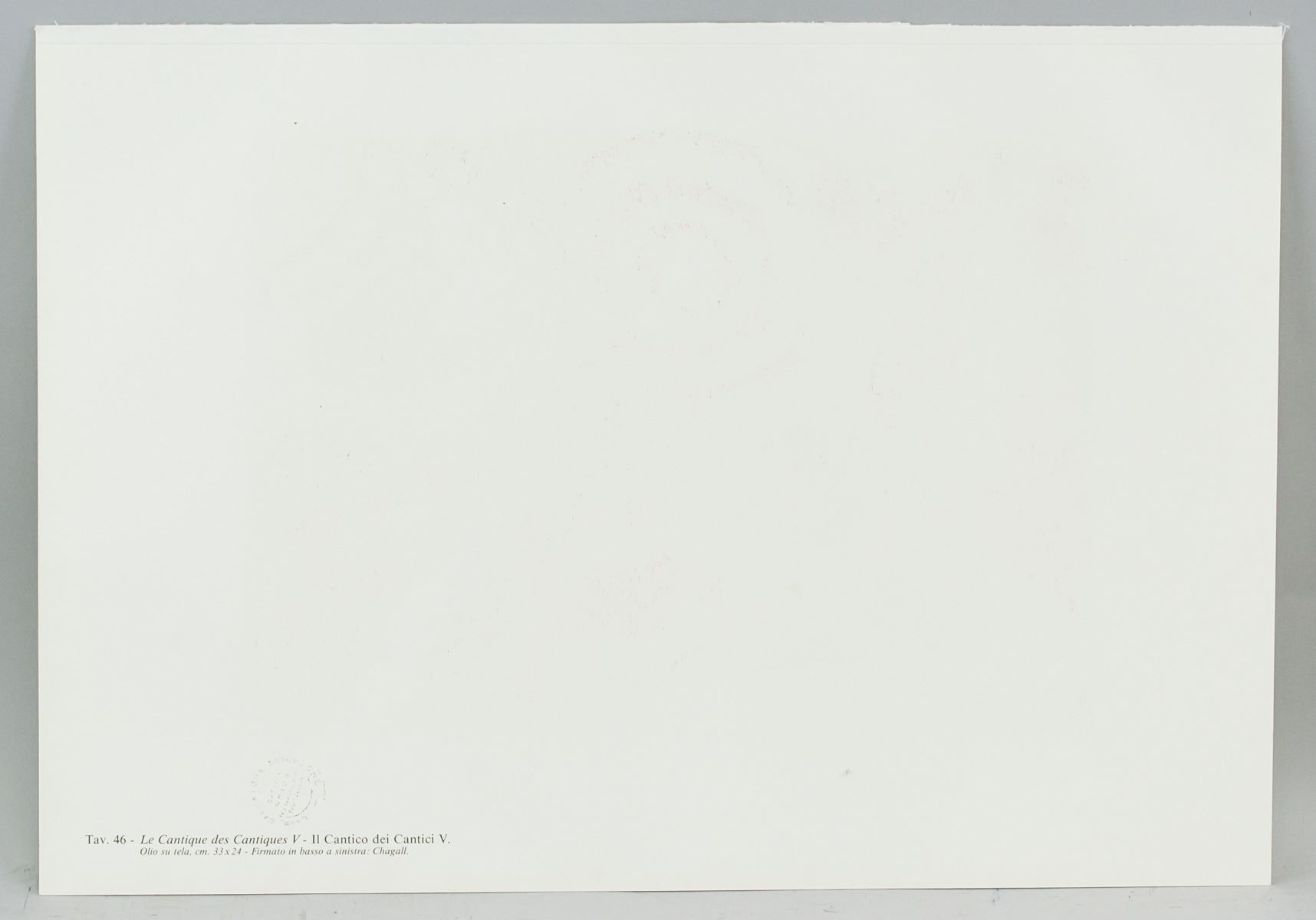Lithograph on paper. Featuring a surrealist composition landscape scene. Signed Marc Chagall in pencil on the lower right corner. Raised embossed inscription, "MArC chAgAll" below signature. On verso, inscribed Tav. 46 - Le Cantique des Cantiques V - Il Cantico dei Cantici V. / Olio su tela, cm. 33 x 24 - Firmato in basso a sinistra: Chagall and stamped above. Attributed to Marc Chagall (1887-1985, Russian-French). 35 x 50 cm (13.75 x 19.5 inches). PROVENANCE: This item has limited provenance from a Southern Ontario estate