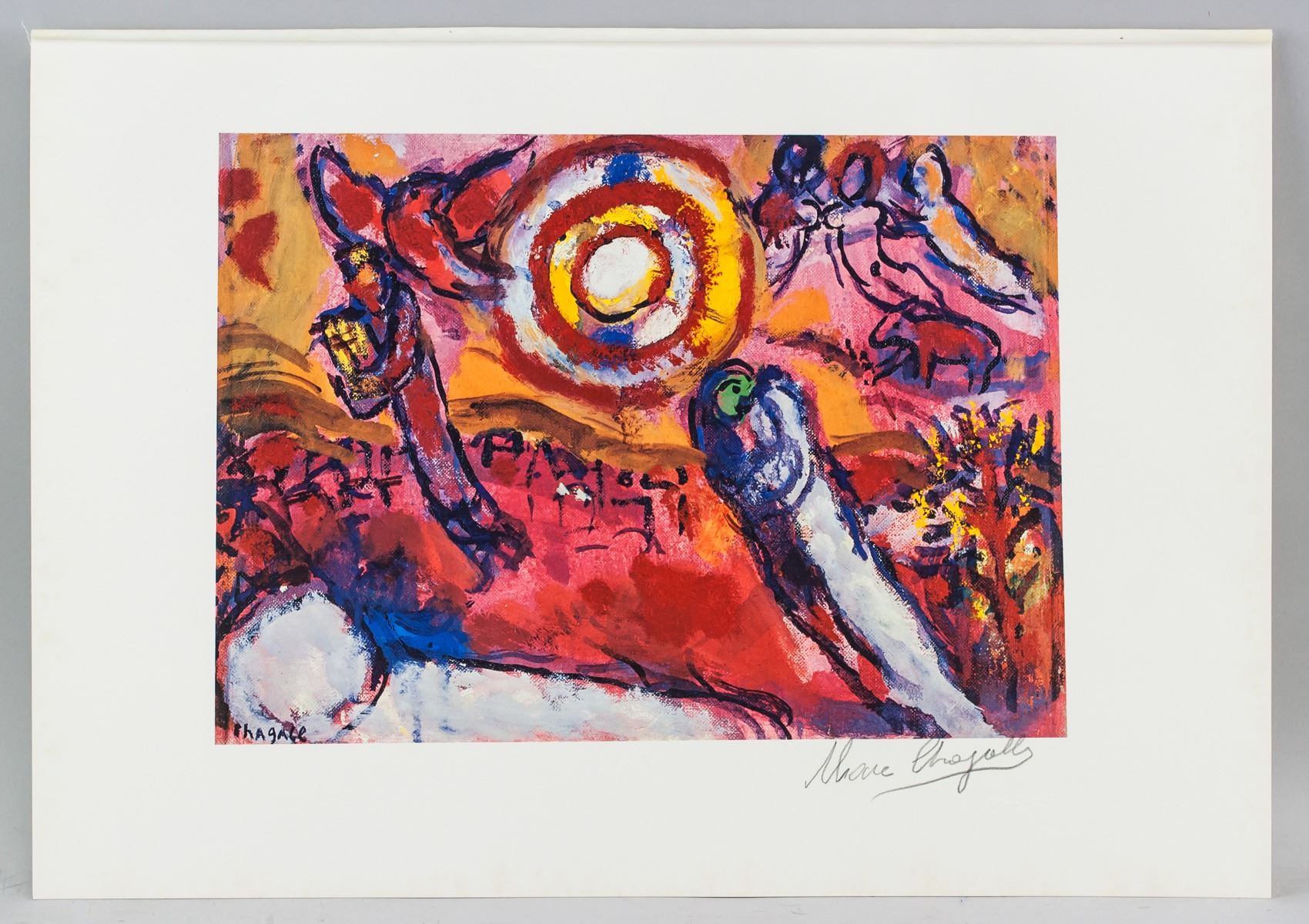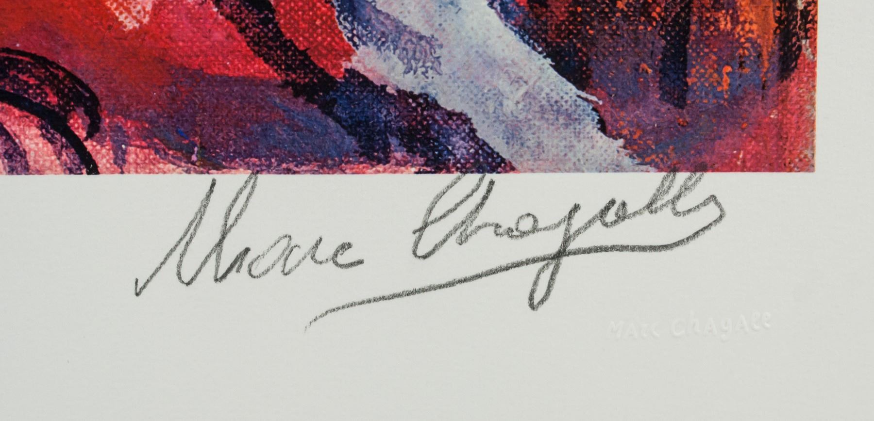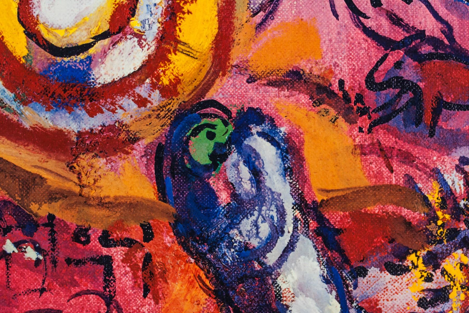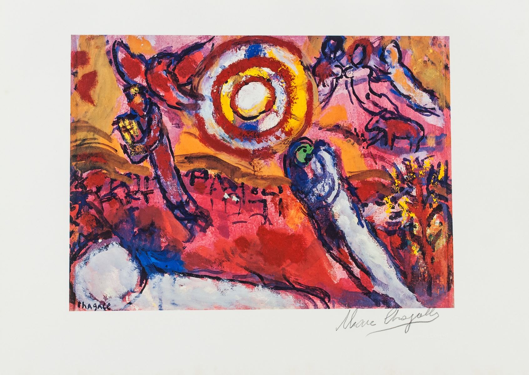 Lithograph on paper. Featuring a surrealist composition landscape scene. Signed Marc Chagall in pencil on the lower right corner. Raised embossed inscription, "MArC chAgAll" below signature. On verso, inscribed Tav. 46 - Le Cantique des Cantiques V - Il Cantico dei Cantici V. / Olio su tela, cm. 33 x 24 - Firmato in basso a sinistra: Chagall and stamped above. Attributed to Marc Chagall (1887-1985, Russian-French). 35 x 50 cm (13.75 x 19.5 inches). PROVENANCE: This item has limited provenance from a Southern Ontario estate