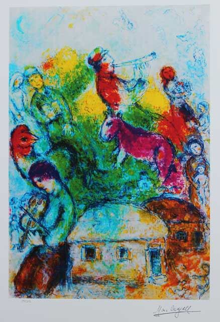 Artist: Marc Chagall - Title: Shofar - Medium: Fine Art Giclee on Paper - Signature: Facsimile Signed - Limited Edition: 375 - Image Size: Approximately 19.5 inches x 12.75 inches - Paper Size: Approximately 23.75 inches x 15 inches - Framed: Unframed - Biography: One of the greatest names in the history of art is Marc Chagall. Born in old Czarist Russia in 1887, he lived to the ripe old age of 98. His passing came in his adopted home in Paris. Chagall's story begins with the Primitivist Movement of the turn of the century. He moved to Paris in 1910, where he studied the masters Cezanne, Van Gogh and Paul Gauguin. Drawn to the excitement of the Russian Revolution, he returned to Russia in 1914 and founded the Constructionist School in 1917. - After two years of intense controversy and artistic conflict, Chagall returned to a dreamy fairy tale art form that is the modern forerunner of Traditional Surrealism. His grandest showing is at the Hermitage in St. Petersburg, Russia, the largest art museum on earth. He is displayed at the most important museums without exception. His original oils bring millions of dollars art auction. His signed and numbered graphics command tens of thousands. -