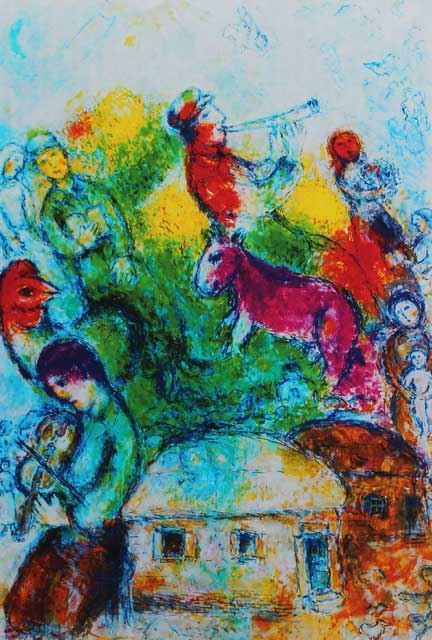 Artist: Marc Chagall - Title: Shofar - Medium: Fine Art Giclee on Paper - Signature: Facsimile Signed - Limited Edition: 375 - Image Size: Approximately 19.5 inches x 12.75 inches - Paper Size: Approximately 23.75 inches x 15 inches - Framed: Unframed - Biography: One of the greatest names in the history of art is Marc Chagall. Born in old Czarist Russia in 1887, he lived to the ripe old age of 98. His passing came in his adopted home in Paris. Chagall's story begins with the Primitivist Movement of the turn of the century. He moved to Paris in 1910, where he studied the masters Cezanne, Van Gogh and Paul Gauguin. Drawn to the excitement of the Russian Revolution, he returned to Russia in 1914 and founded the Constructionist School in 1917. - After two years of intense controversy and artistic conflict, Chagall returned to a dreamy fairy tale art form that is the modern forerunner of Traditional Surrealism. His grandest showing is at the Hermitage in St. Petersburg, Russia, the largest art museum on earth. He is displayed at the most important museums without exception. His original oils bring millions of dollars art auction. His signed and numbered graphics command tens of thousands. -