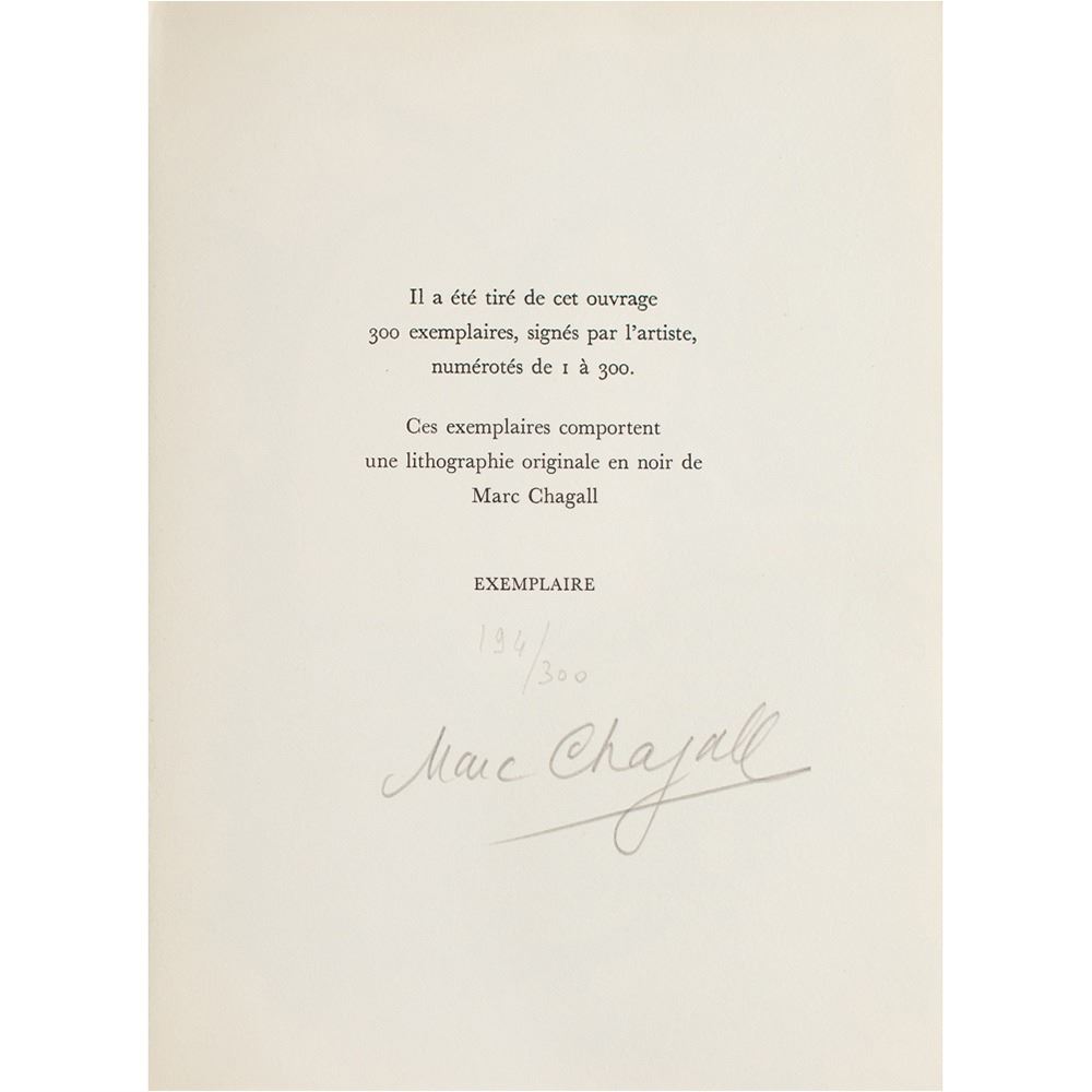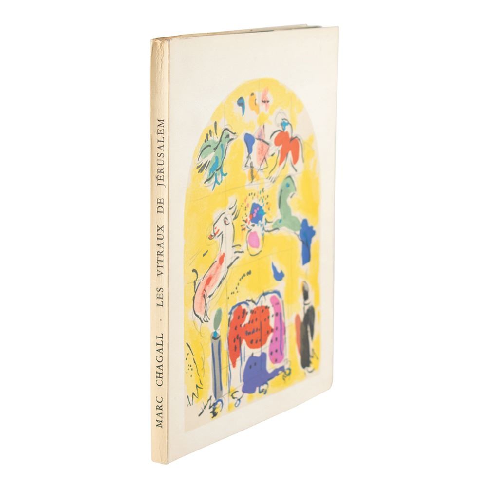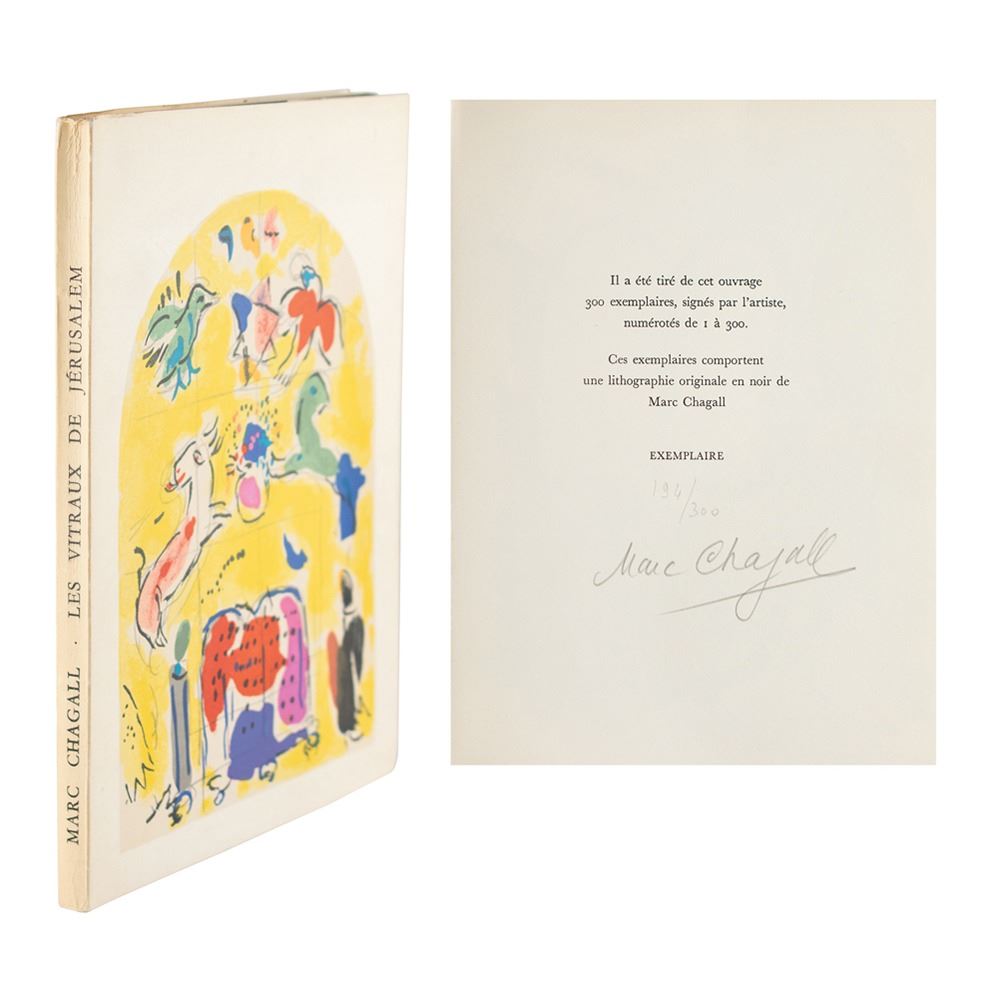 Signed book: Vitraux pour Jerusalem. First edition, limited issue, numbered 194/300. Paris: Musee des Arts Decoratifs, 1961. Softcover, 7.25 x 9.75, 88 pages. Signed on the tipped-in colophon in pencil by the artist, "Marc Chagall," with attached original lithograph. In fine condition.