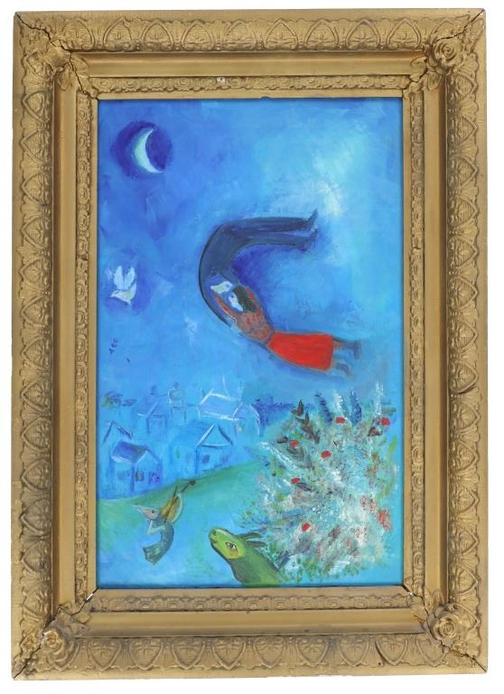 This is an original painting on canvas in the style and manner of Marc Chagall. The piece is not signed. The painting exhibits the classic Marc Chagall abstract design with a young couple dancing in the midnight air, beneath a crescent moon with an Orthodox Church / village in the background. The image shows a fish playing a violin, bouquet of flowers. This appears to be an early painting in an original antique frame. The piece is incredibly similar in technique, style and manner as well as being in an antique gilt wood frame as the “Le Bouquet d’Amour by Marc Chagall, “Les Maries dans le Ciel” by Marc Chagall, amongst others. The latter showing a wedding of two lovers flying through the sky with a bouquet of flowers, a man playing the violin all in the midnight sky with a crescent moon above and Orthodox church / village below (an image of this painting is included for reference). Marc Chagall (Russian/French, 1887-1985). While the piece is definitely in the style of Marc Chagall, it is not signed and while it could be by Marc, there is no reason or documentation to support this. Artist Unknown. The frame measures 27.75" x 19.75" and the canvas measures 22" by 14.25".