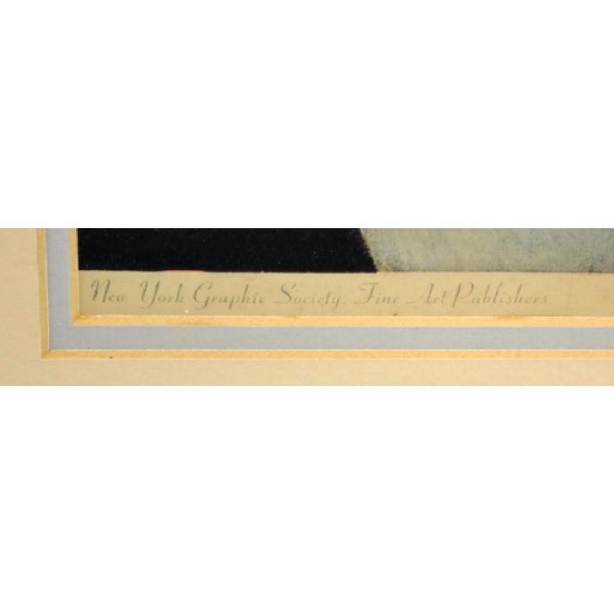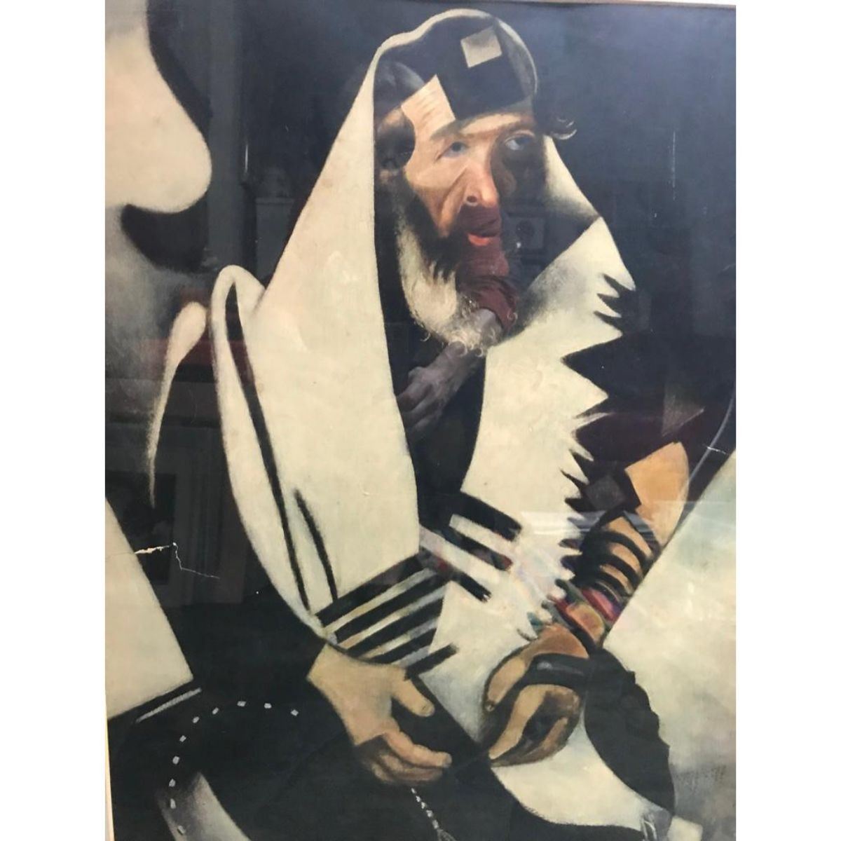 Marc Chagall, The Praying Jew ( The Rabbi of Vitebsk ) 1948 New York Graphic Society Lithograph, Print, presented under glass in wooden frame of the era. 23 3/4" X 18".  **** some tears to lithograph inside the frame that will require repair, as shown in photos.  About Marc Chagall  - Described by art critic Robert Hughes as "the quintessential Jewish artist of the twentieth century," the Russian-French modernist Marc Chagall worked in nearly every artistic medium. Influenced by Symbolism, Fauvism, Cubism & Surrealism, he developed his own, distinctive style, combining avant-garde techniques and motifs with elements drawn from Eastern European Jewish folk art. Â