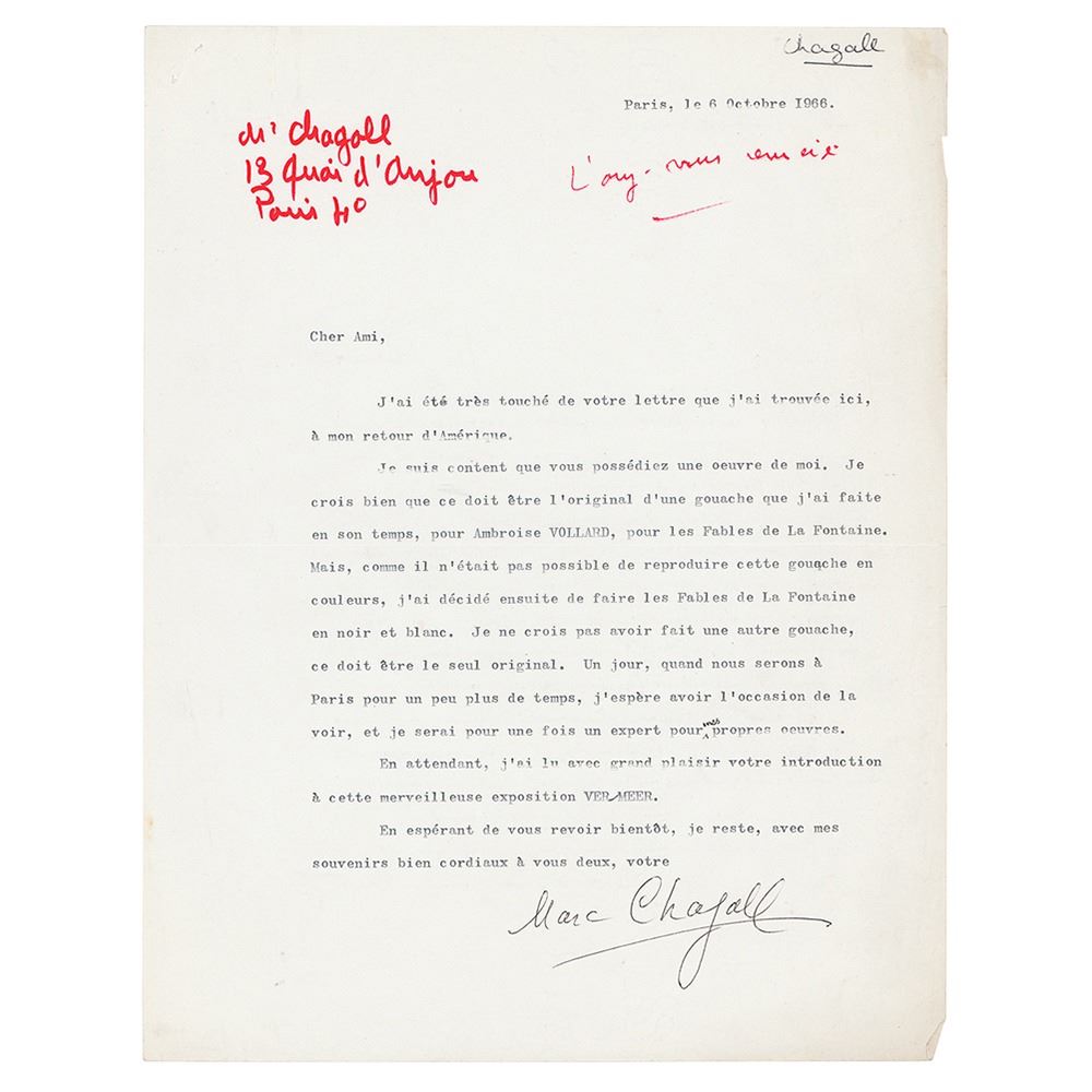TLS in French, one page, 8.25 x 10.5, October 6, 1966. Letter concerning a color drawing for the Fables of La Fontaine, in part (translated): "I'm glad you own a work of mine. I do believe that it must be the original of a gouache that I did in its day, for Ambroise Vollard, for La Fontaine's Fables. But, as it was not possible to reproduce this gouache in color, I then decided to do La Fontaine's Fables in black and white. I don't think I did another gouache, it must be the only original." In very good to fine condition, with light edge creasing, and staple holes and paperclip impressions to the upper left corner.