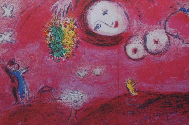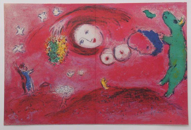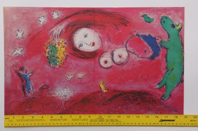 Marc Chagall, double page from Derriere Le Miroir (Ca. 1970) printed by Maeght, France. SIZE: see attached ruler photo. Photos are part of the description representing the condition report and can be used for authentication prior to the sale date. Pangaea Auctions urges Bidder's to view all attached photos in detail.