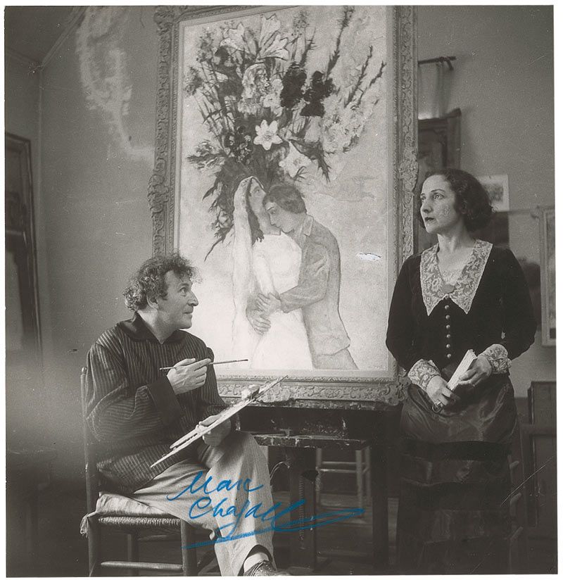 Russian-born painter (1887–1985) whose colorful, fanciful depictions of peasant life, Judaica, and other subjects earned him a place among the most popular visual artists of the twentieth century. Matte-finish 8.25 x 8.5 photo of Chagall working on his 1930s painting entitled ‘The Bridal Couple,’ with a female model posing next to the painting, signed in blue artist’s pencil. In very good condition, with lightly trimmed edges, a diagonal crease to lower right corner, small touched-up area to background, and a few small areas of light discoloration.