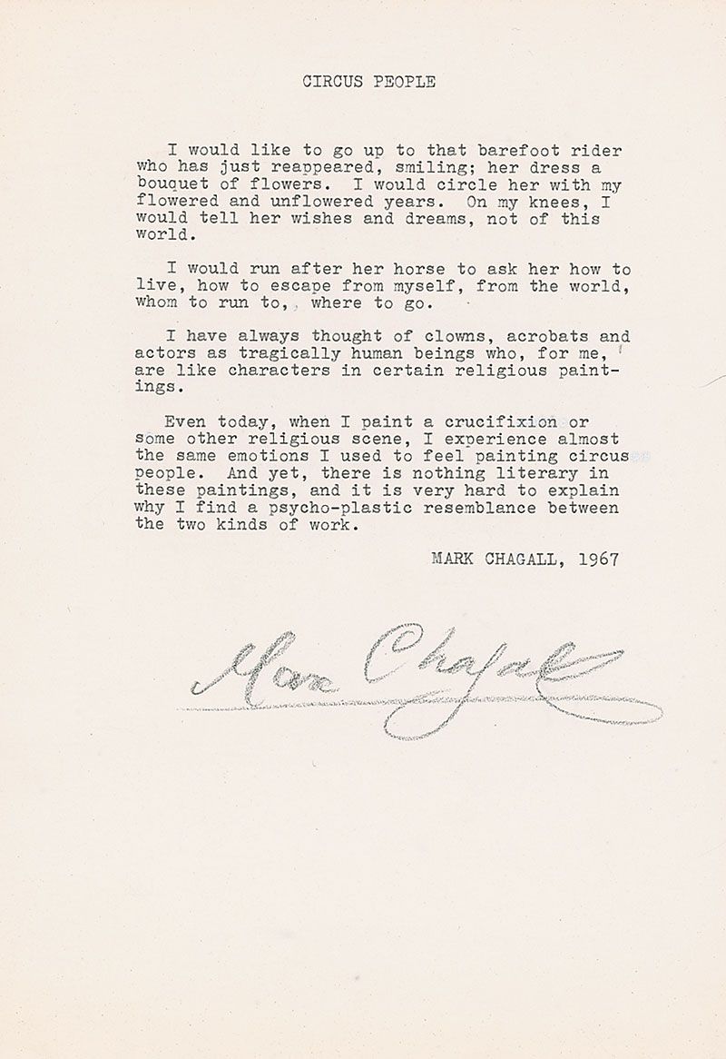 Typed manuscript entitled ‘Circus People,’ one page, 7.25 x 10.5, dated 1967. Manuscript reads, in part: “I have always thought of clowns, acrobats and actors as tragically human beings who, for me, are like characters in certain religious paintings. Even today, when I paint a crucifixion or some other religious scene, I experience almost the same emotions I used to feel painting circus people.” Signed at the conclusion in black artist’s pencil by Chagall. In fine condition, with a few scattered light creases.