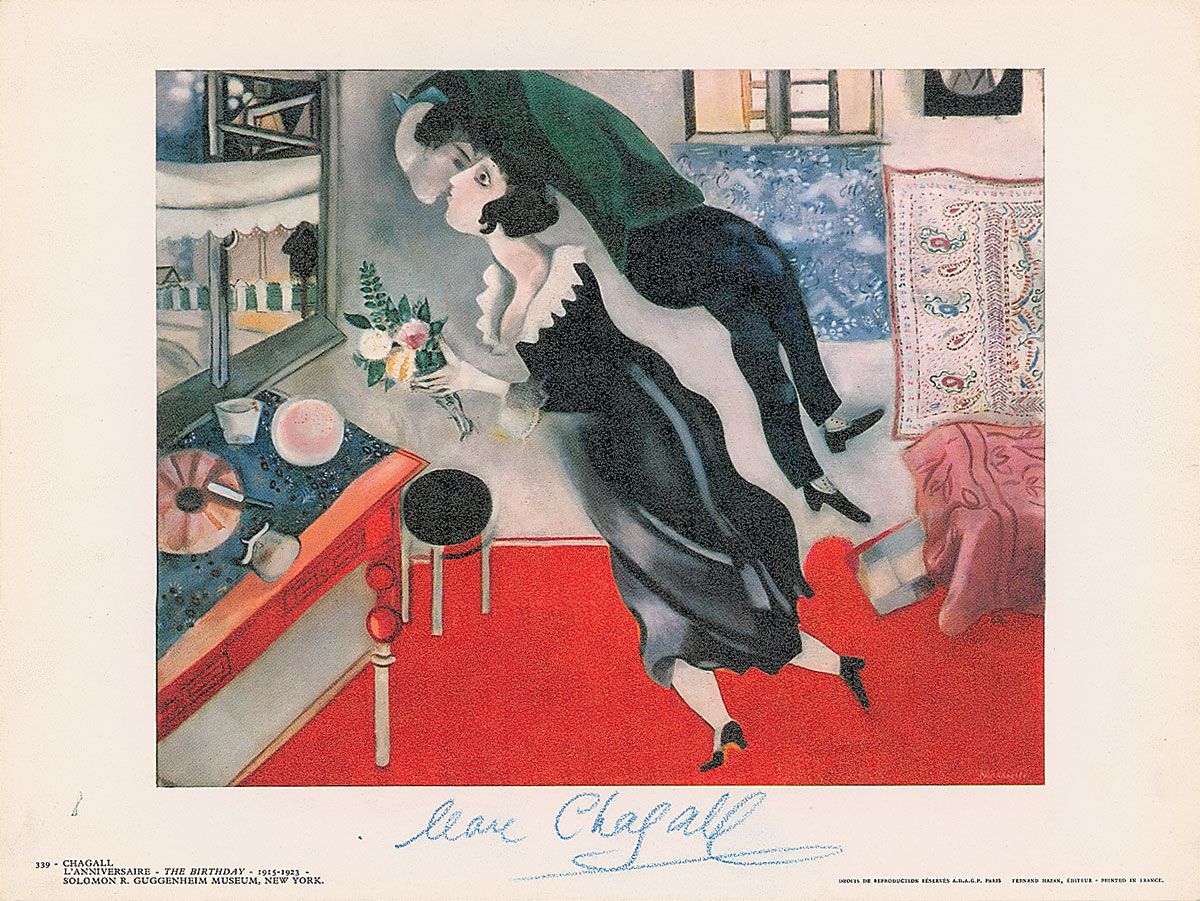 Russian-born painter (1887–1985) whose colorful, fanciful depictions of peasant life, Judaica, and other subjects earned him a place among the most popular visual artists of the twentieth century. Color 12.5 x 9.5 print entitled ‘The Birthday,’ signed in the lower border in blue artist’s pencil. In fine condition, with a trivial corner tip crease and stray ink mark to border. A lovely, uncommon print ideal for display.