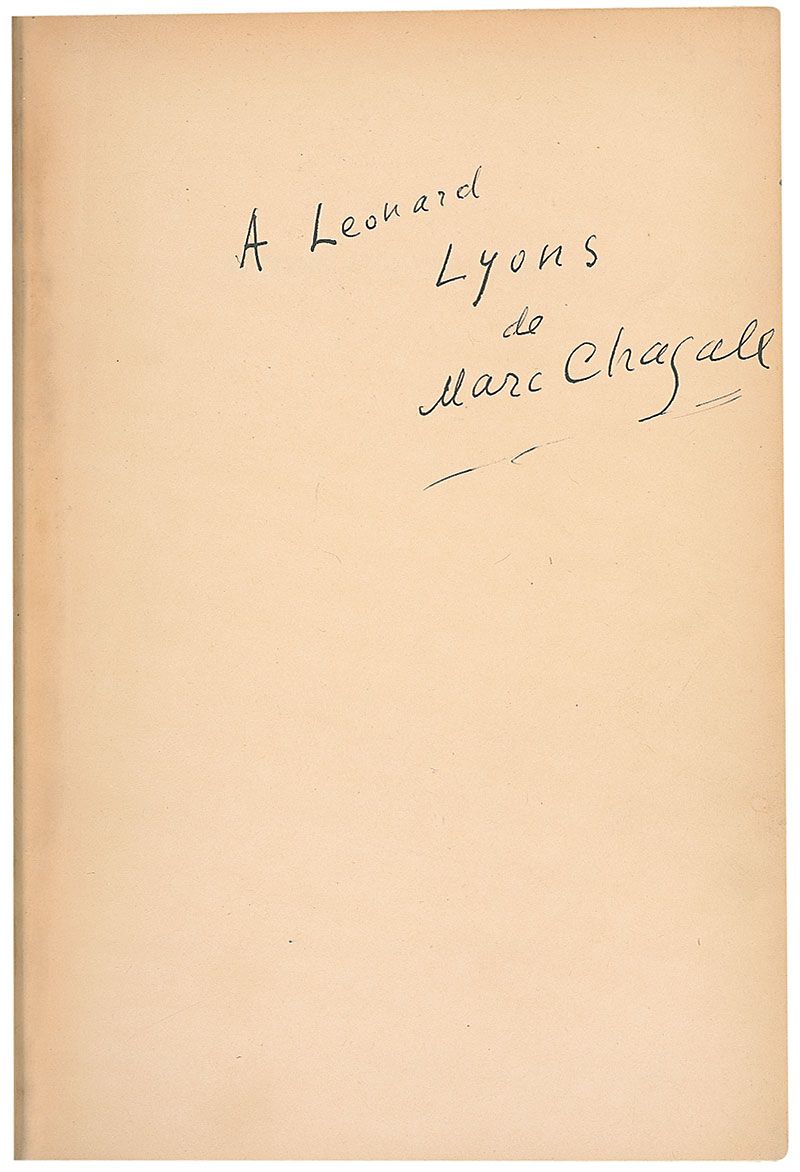 Signed book: Painting and Painters. NY: Charles Scriber's Sons, 1945. Hardcover, 6.5 x 9.5, 250 pages. Signed and inscribed on the first free end page to New York Times columnist Leonard Lyons, “A Leonard Lyons de March Chagall.” Autographic condition is fine with a uniform shade of mild toning to signed page. Book condition: VG/None. Red cloth-covered boards; slight wear to edges; small tears in cloth along upper 1/2 inch of hinges; spine sunned (title illegible); yellowed; minor stain to two pages.
