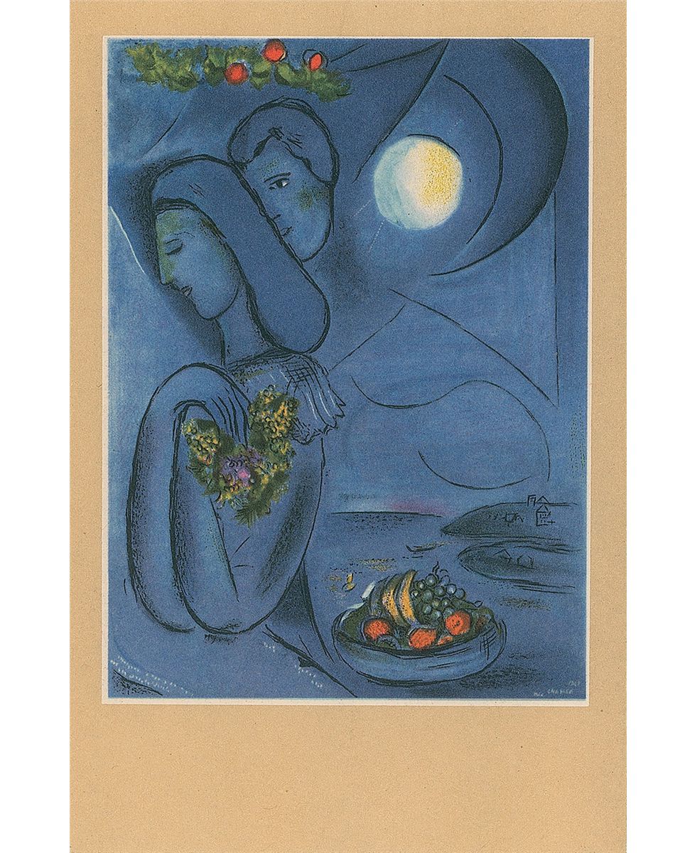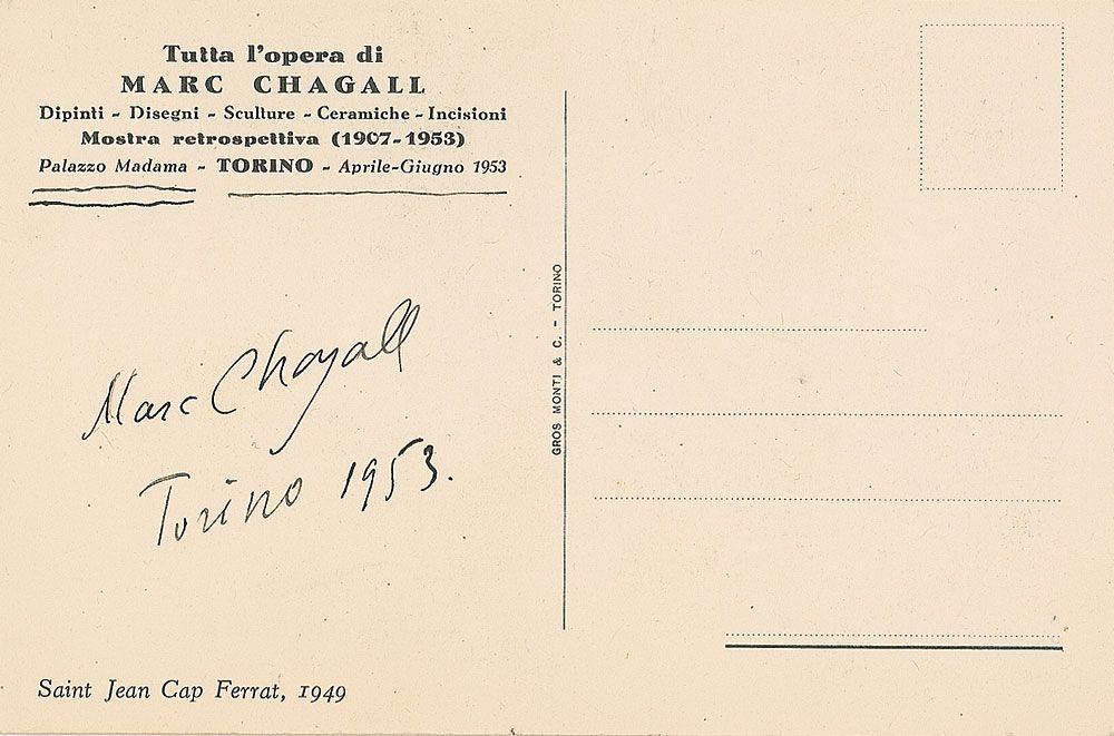 Color postcard featuring Chagall’s 1949 work entitled ‘Saint Jean Cap Ferrat,’ 3.75 x 5.75, signed on the reverse in black ink, “Marc Chagall, Torino 1953.” In fine condition.