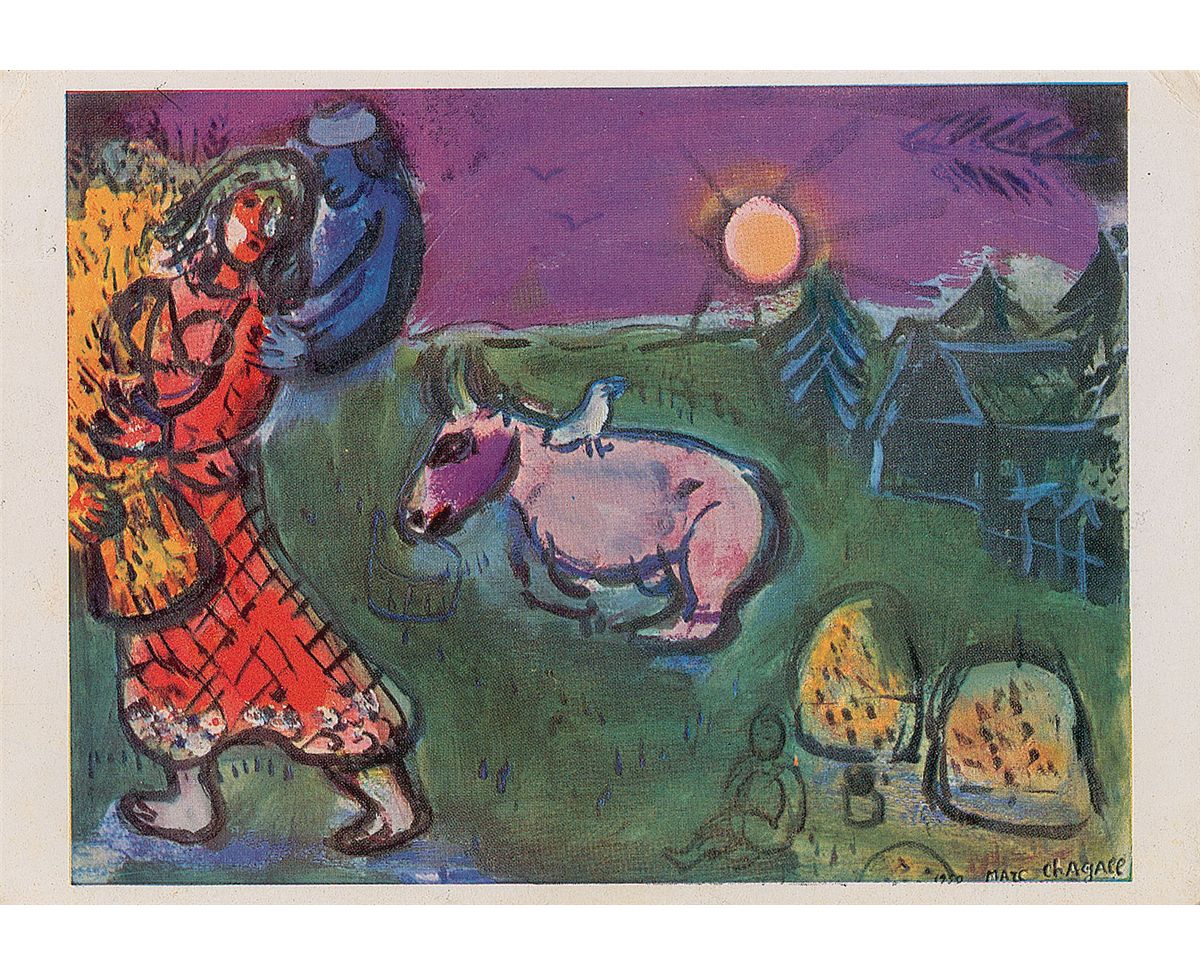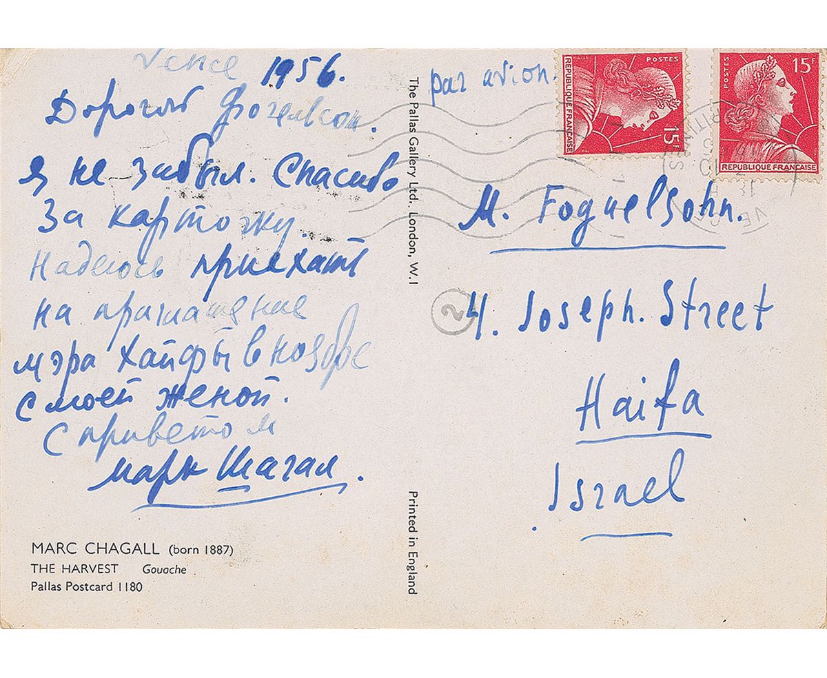 Scarce ALS written and signed in Russian, one page on a 6 x 4 postcard depicting his colorful work ‘The Harvest,’ dated 1956. Letter to Menachem Foguelsohn in Haifa, Israel. In full (translated): “I have not forgotten. Thanks for the card. I hope to visit with my wife in November, as I have been invited by the mayor of Haifa.” In fine condition.
