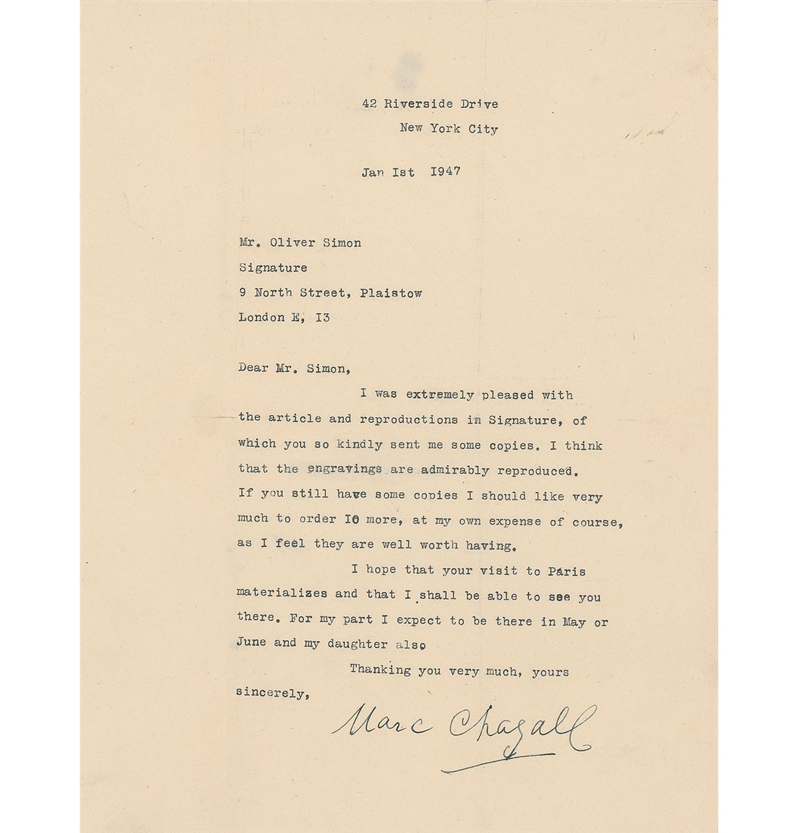 TLS, one page, 8.5 x 11, January 1, 1947. Letter to Oliver Simon, editor of the journal Signature: A Quadrimestrial of Typography and Graphic Arts. In part: “I was extremely pleased with the article and reproductions in Signature, of which you so kindly sent me some copies. I think that the engravings are admirably reproduced. If you still have some copies I should like very much to order 10 more, at my own expense of course, as I feel they are well worth having.” Intersecting folds (small holes at intersections and one vertical fold passing through a single letter of the signature) and a few creases, otherwise fine condition