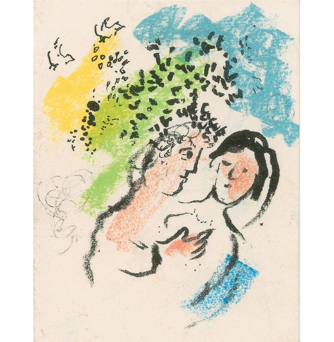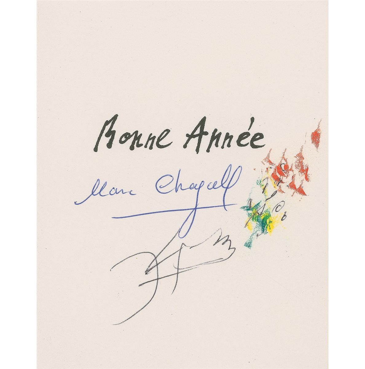 Exceptional hand-colored lithograph print folded as a lettercard, 4.5 x 5.5 when closed, signed inside in blue ballpoint by Chagall below a New Year’s greeting, and adorned with a fabulous ballpoint and colored pencil abstract sketch. In fine condition. A superlative example of the artist’s characteristic style.