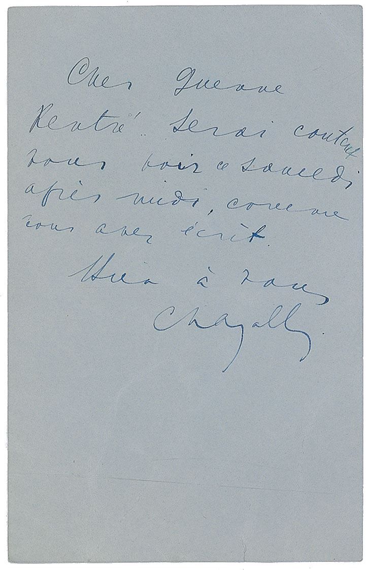 Uncommon ALS in French, signed “Chagall,” one page, 3.75 x 6, no date. Letter to art critic and writer Jacques Guenne, in full (translated): “Returned. Be glad to see you on Saturday afternoon, as you wrote.” In fine condition, with scattered creases and a small tear to the bottom edge.