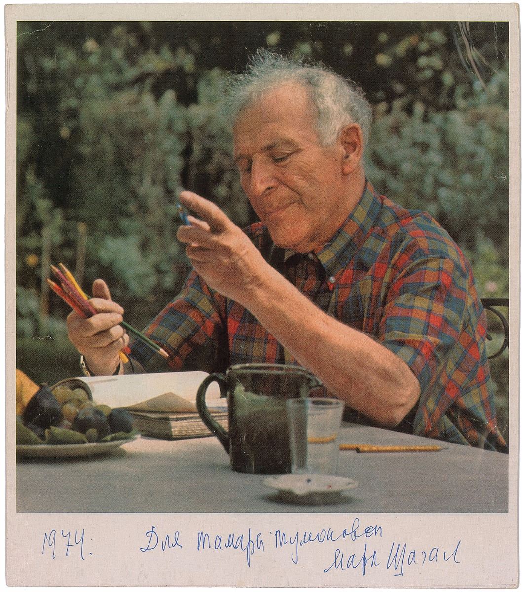 5 x 10.5 magazine photo of Chagall holding various colored pencils as he sketches outside, signed in the lower border in blue ballpoint, adding the date, “1974.” Affixed to a same-size mount. Scattered creasing (mostly confined to edges) and a light paperclip impression to top edge, otherwise fine condition.