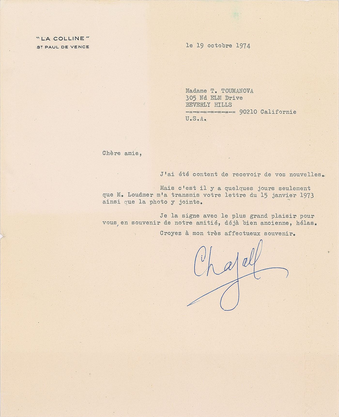 TLS in French, signed “Chagall,” one page, 8.25 x 10.25, La Colline letterhead, October 19, 1974. Letter to noted ballerina Tamara Toumanova. In full (translated): "I was happy to hear from you. But it was only a few days ago that Mr. Loudmer sent me your letter of January 15, 1973 and the photo attached. I sign it with the greatest pleasure for you to remember our friendship, already old, alas. Believe in my very fond memory." In fine condition, with the bottom inch of the letter folded back due to creasing.
