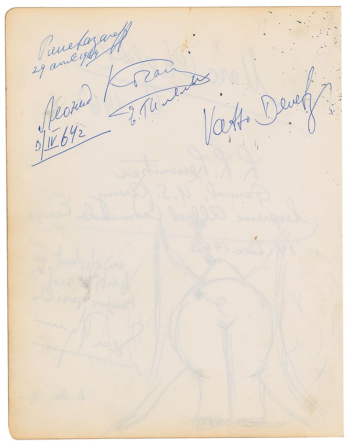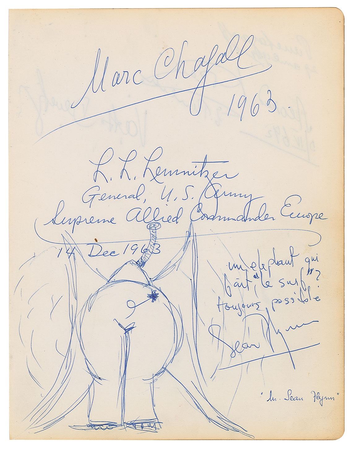 Vintage ballpoint signature, "Marc Chagall, 1963,” on an off-white 7.75 x 10 guestbook page, which is also signed by United States Army general Lyman Lemnitzer and freelance photojournalist Sean Flynn, the son of actor Errol Flynn, who draws a sketch of an elephant's backside. The reverse of the page is signed by French journalist Pierre Lazareff, Soviet violinist Leonid Kogan, and Greek pianist Vasso Devetzi. In fine condition. While Chagall remains desirable in his own right, the presence of the uncommon Flynn, who in 1970 was captured in Cambodia by communist guerillas and was never seen alive again, makes this a decidedly unique guestbook page.
