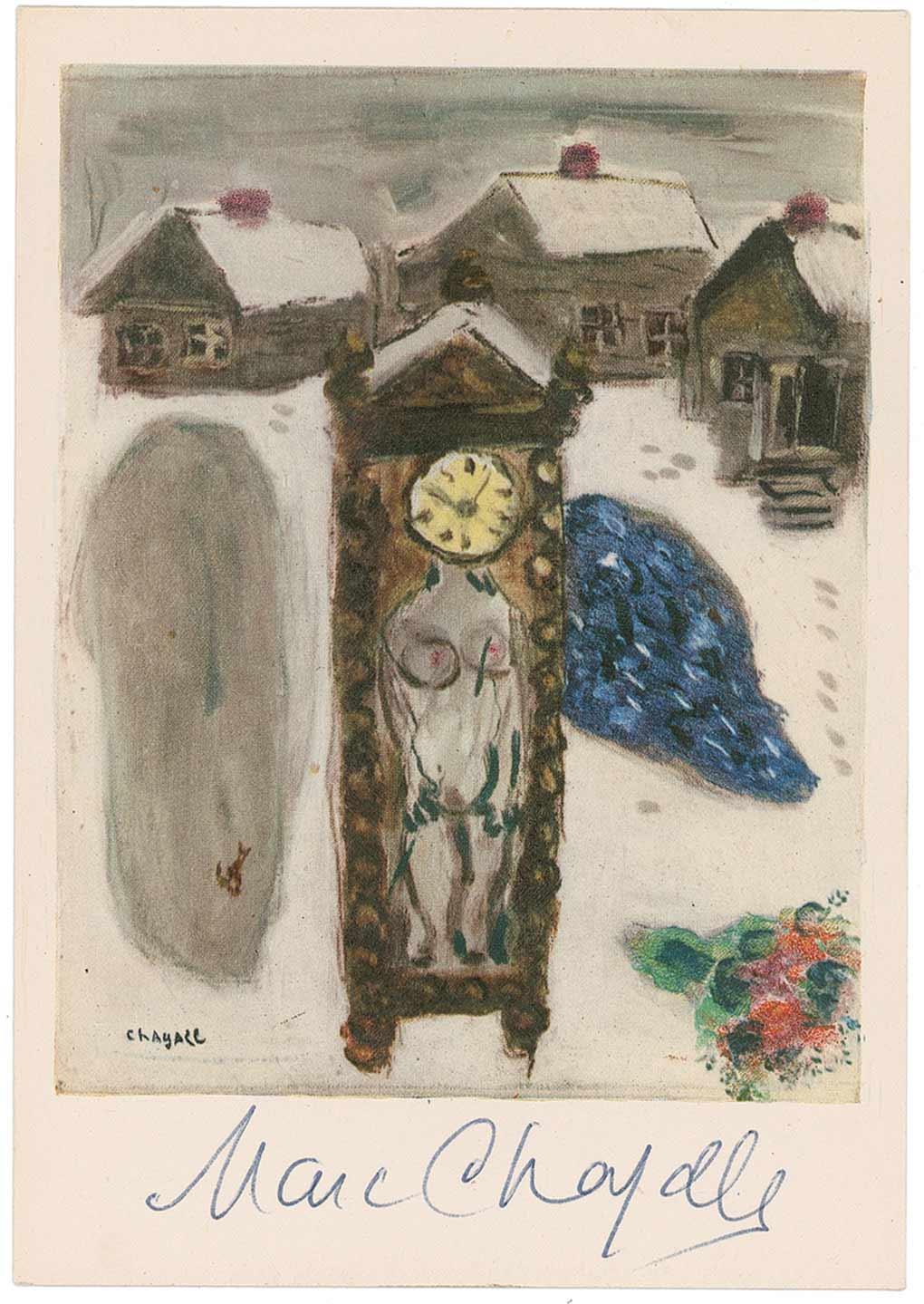 Color 4.25 x 6 postcard photo of Chagall’s work entitled L’Hiver, signed in the lower border in blue ink. In very fine condition.